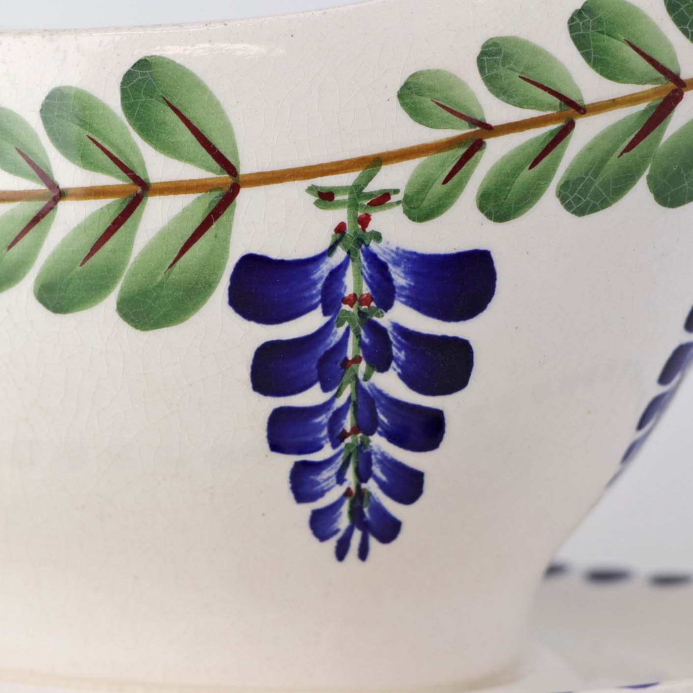 Fajancestel med dekoration af ranker af blåregn og blade på lys baggrund afsluttet med kant af runde blå pletter.