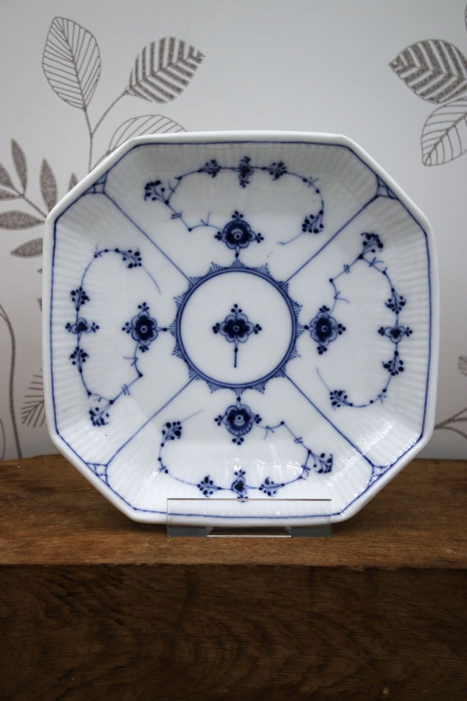 Sjældent , stort 8 kantet sættefad i Musselmalet Riflet fra Royal Copenhagen. 18x18cm.