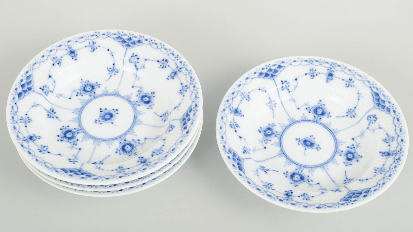 Royal Copenhagen Musselmalet Halvblonde, sæt af fire små dybe tallerkener.
