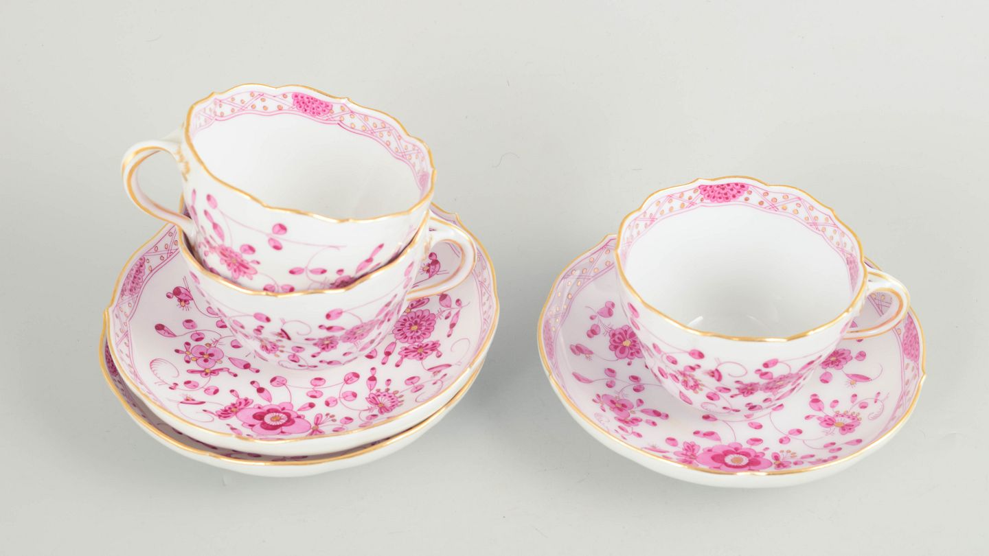 Meissen, "Pink Indian" sæt af tre store kaffekopper med underkopper.