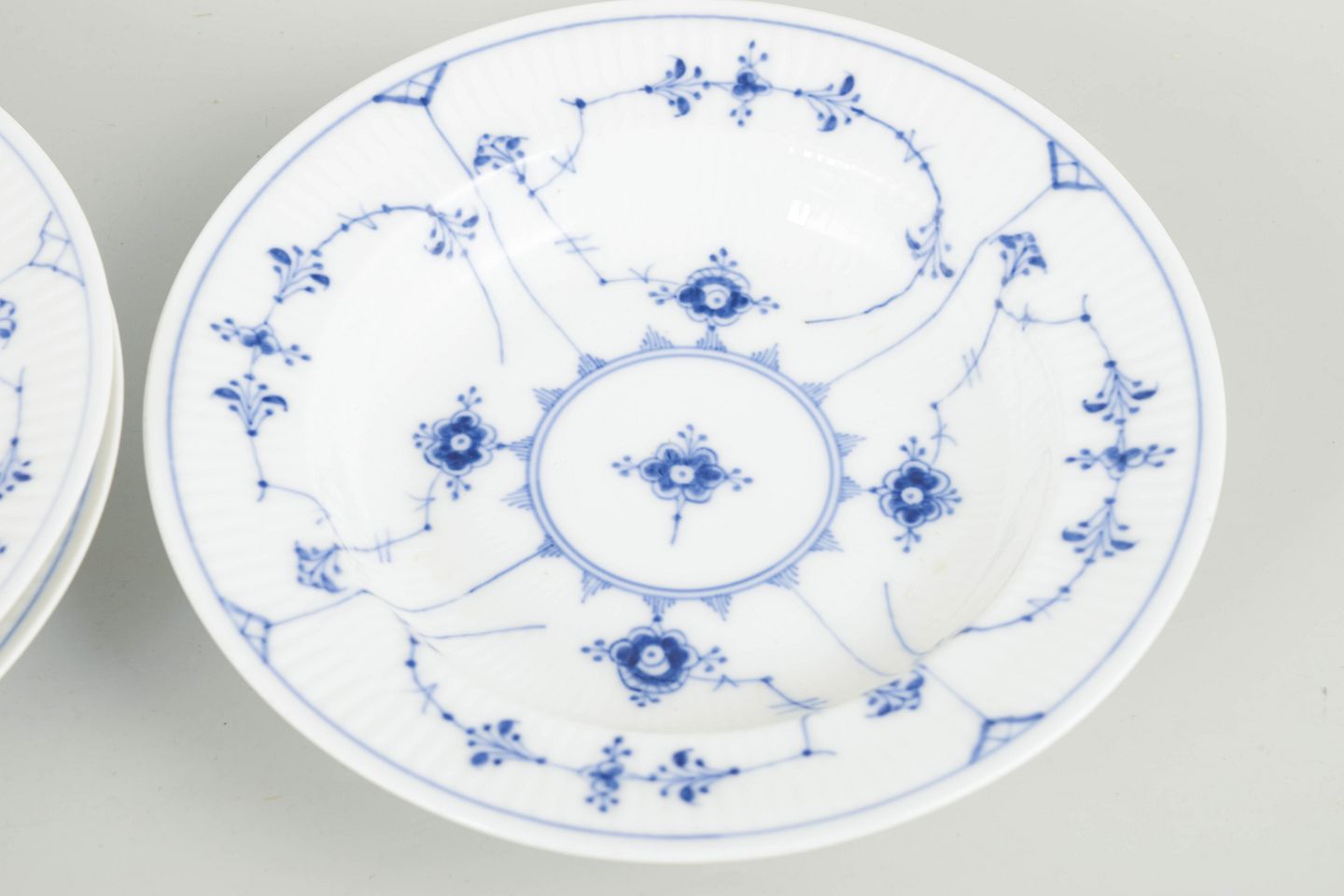Sæt af tre dybe tallerkener i håndmalet porcelæn fra Musselmalet Riflet med klassisk underglasurdekoration i koboltblå. Model 1/170. Første sortering.