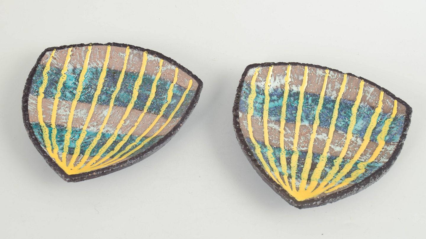 To mindre ovale keramikfade model 2548, udført i stentøj med reliefdekoration og flerfarvet glasur i blå og gule nuancer.