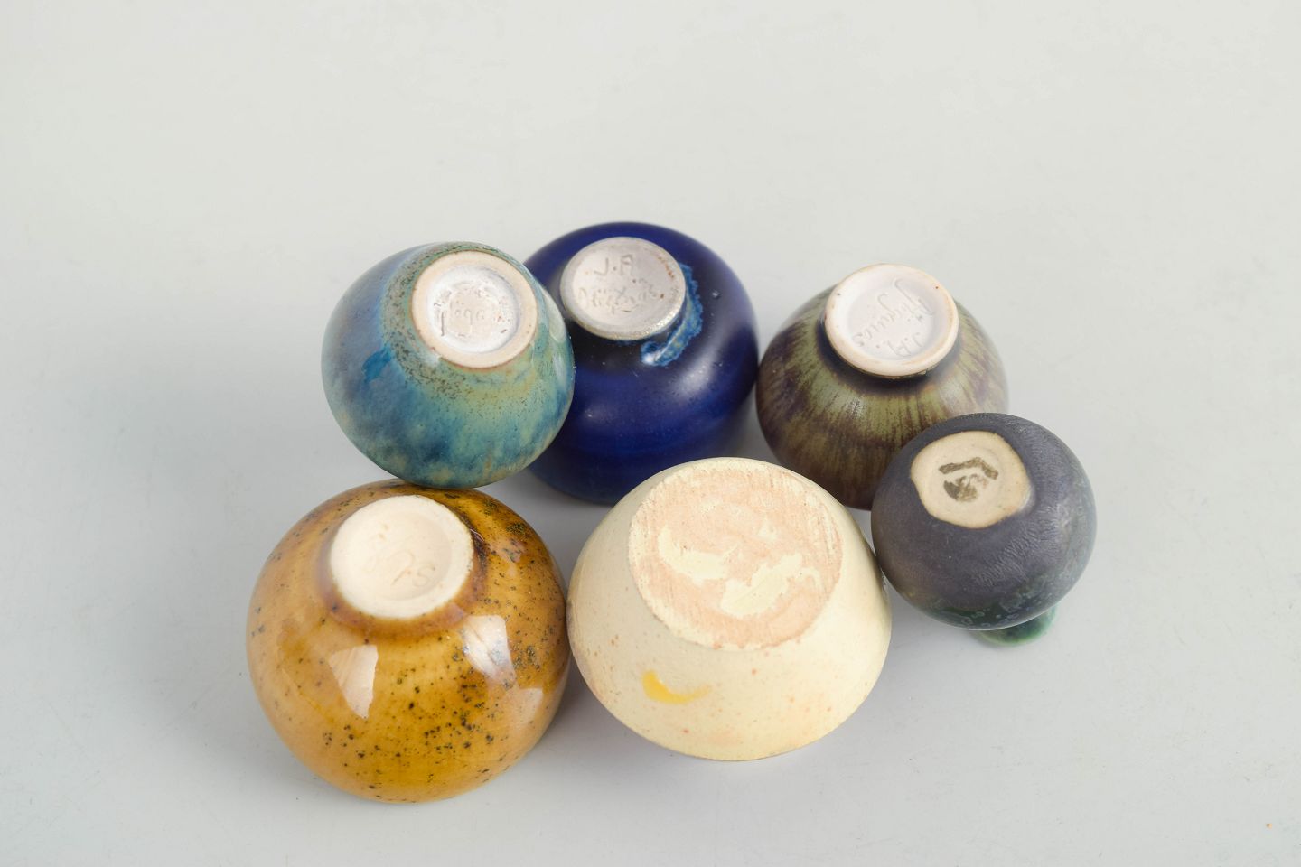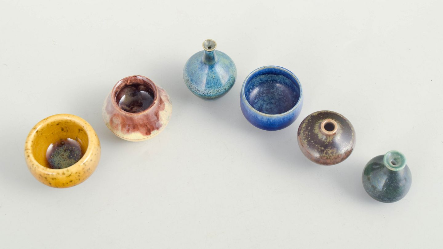 Samling af seks miniature keramikgenstande bestående af små skåle og vaser i forskellige former og glasurer. Fremstillet i keramik med flerfarvede glasurer i blå, brune og gule nuancer. Tre eksemplarer er fra Höganäs og andre fra forskellige producenter.