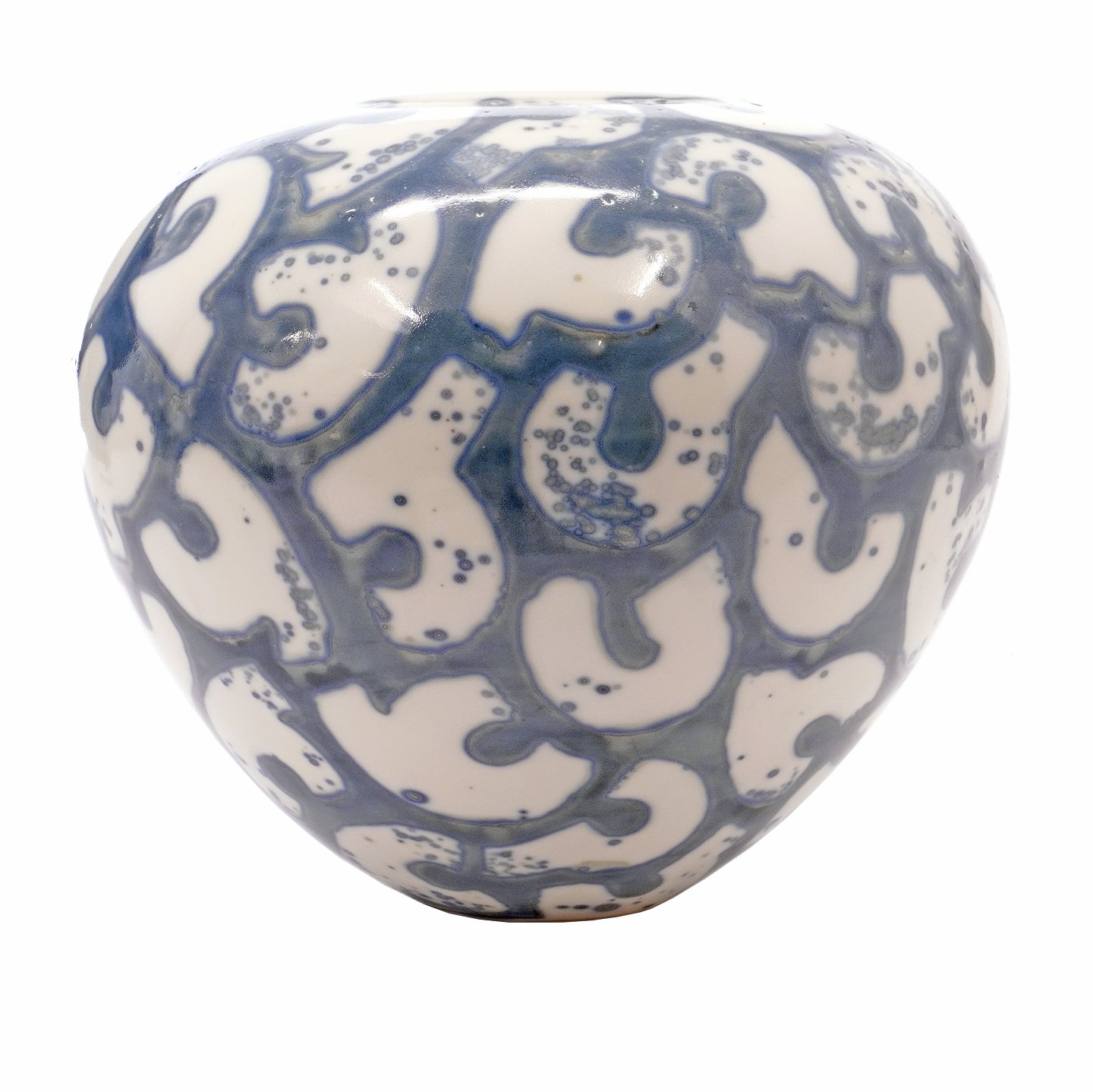 Per Weiss vase. Per Weiss, 1953-2023, vase i stentøj med blå glasur og geometrisk mønster. H: 20cm. D: 20cm