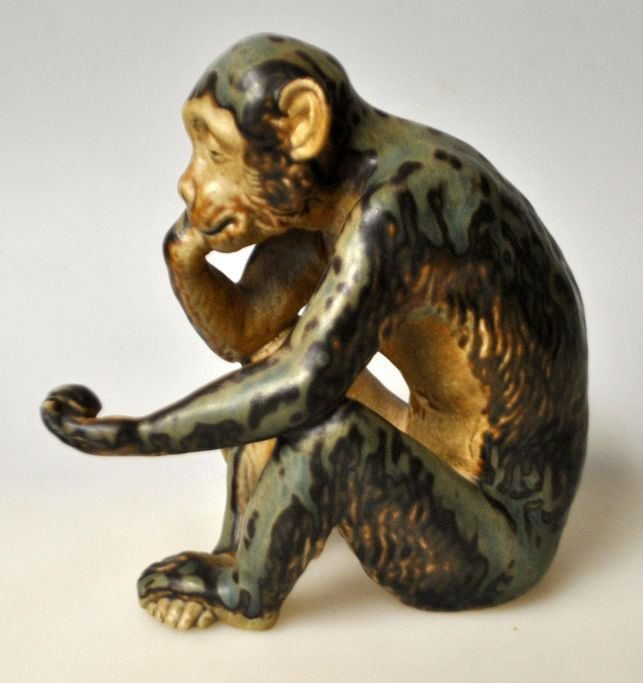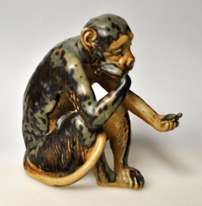 Bing & Grøndahl figur, 20. årh. København, Danmark: En abe med en skildpadde. No. 1510. Stentøj. Sung glasur. Stemplet. H.: 13,5 cm. Design:: Dahl Jensen. 1. Sortering.