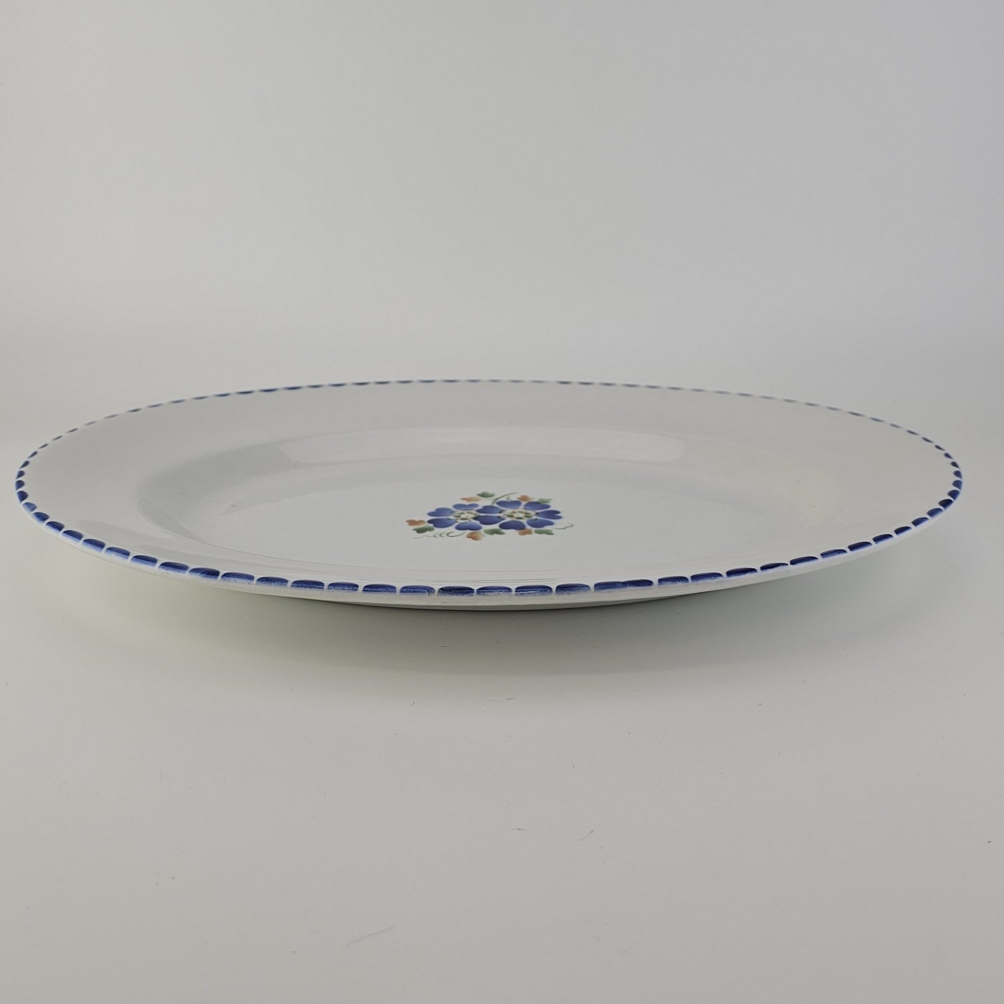 Ovalt fad i fajance fra stellet Geranium II fremstillet i perioden 1927-1940.