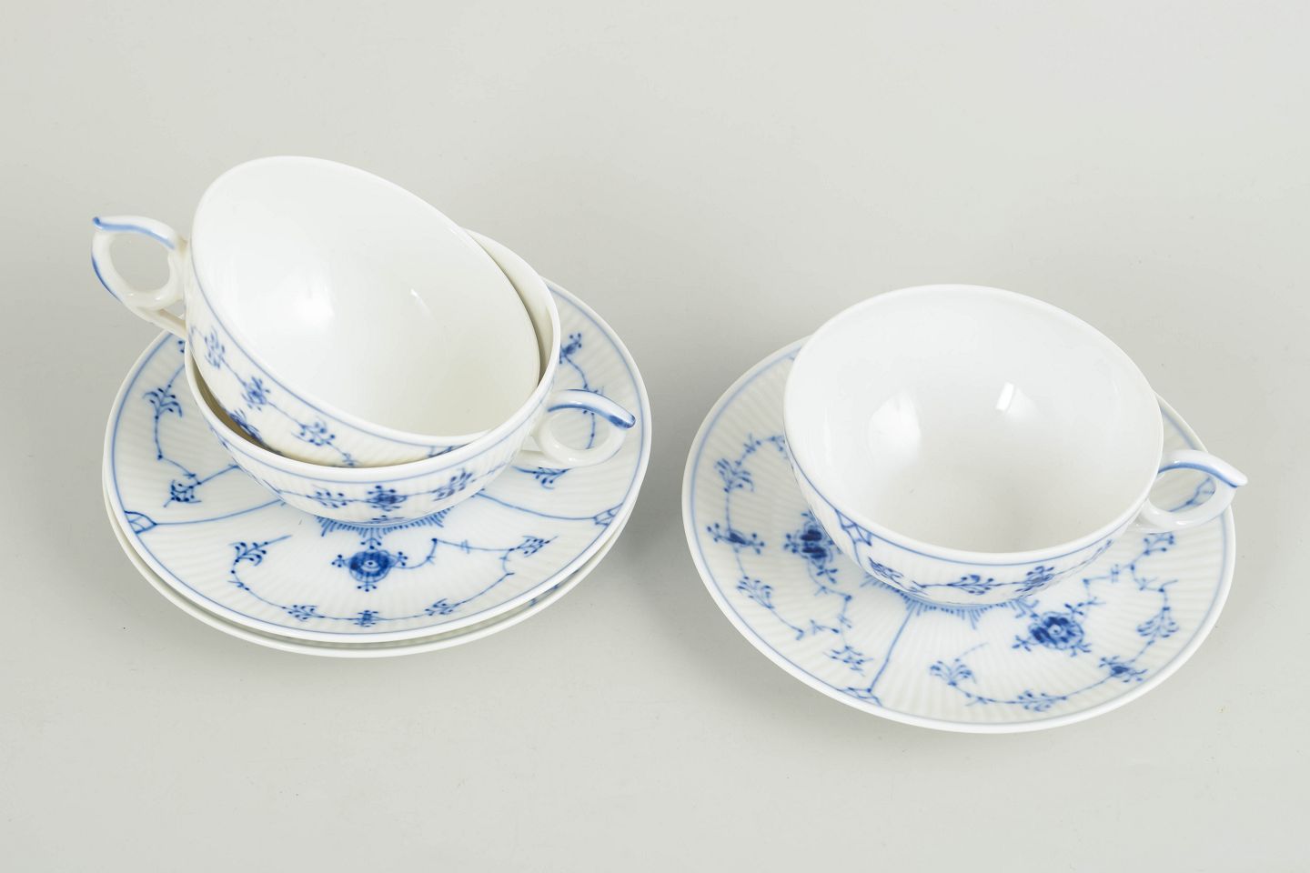 Royal Copenhagen Musselmalet Riflet sæt af tre tekopper med tilhørende underkopper.