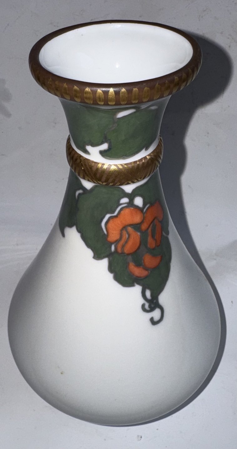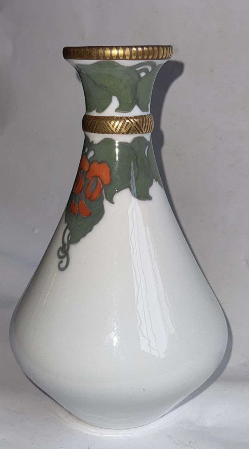Art Nouveau vase i porcelæn fra Royal Copenhagen med smuk og farverig dekoration med bl.a. guld, oberst på vasen. Fremstår i perfekt stand. 1. Sortering. Fabriksmærket på bunden. Fremstillet mellem 1900-1923. Mål: H. 20,5 cm