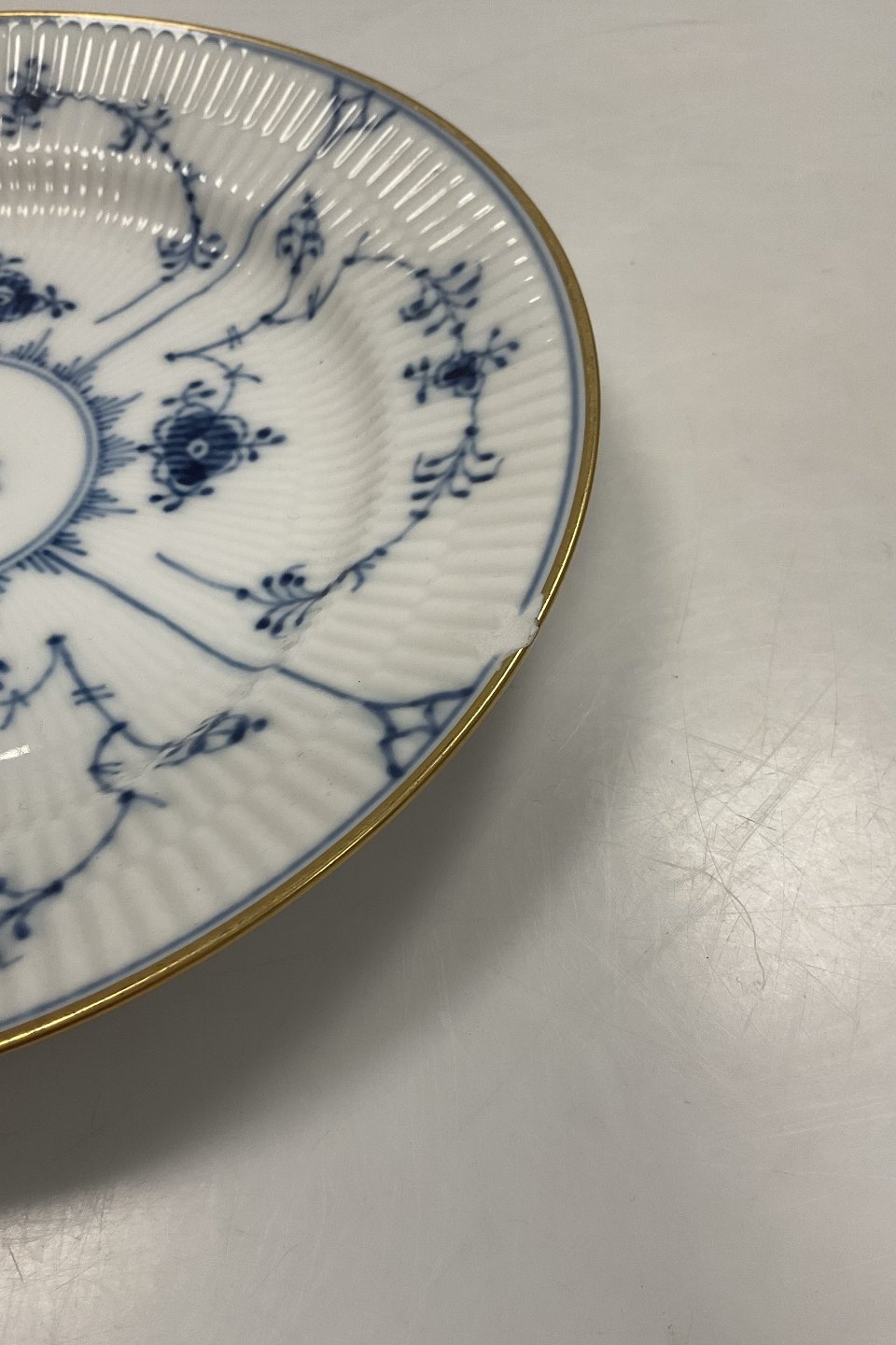 Royal Copenhagen Musselmalet Riflet Frokosttallerken med guld Dannebrog No. 178