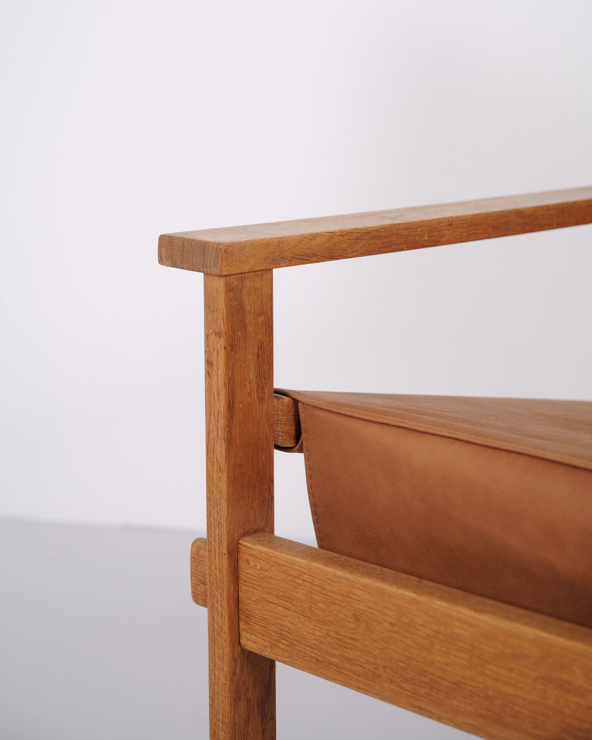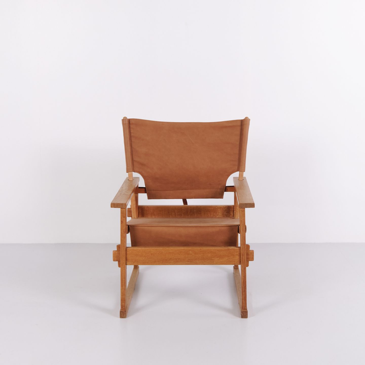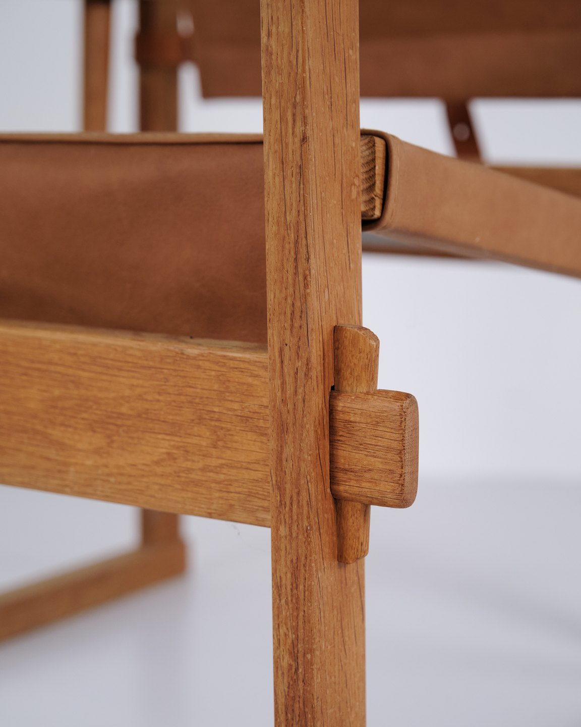 The design is characterized by a sturdy construction and clean lines, typical of Danish furniture design from the early 1960s. The combination of oak and saddle leather highlights the chair’s craftsmanship and comfort.