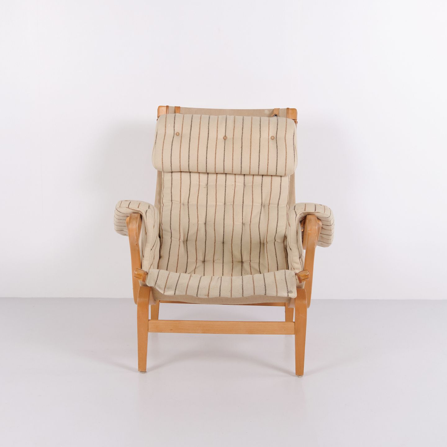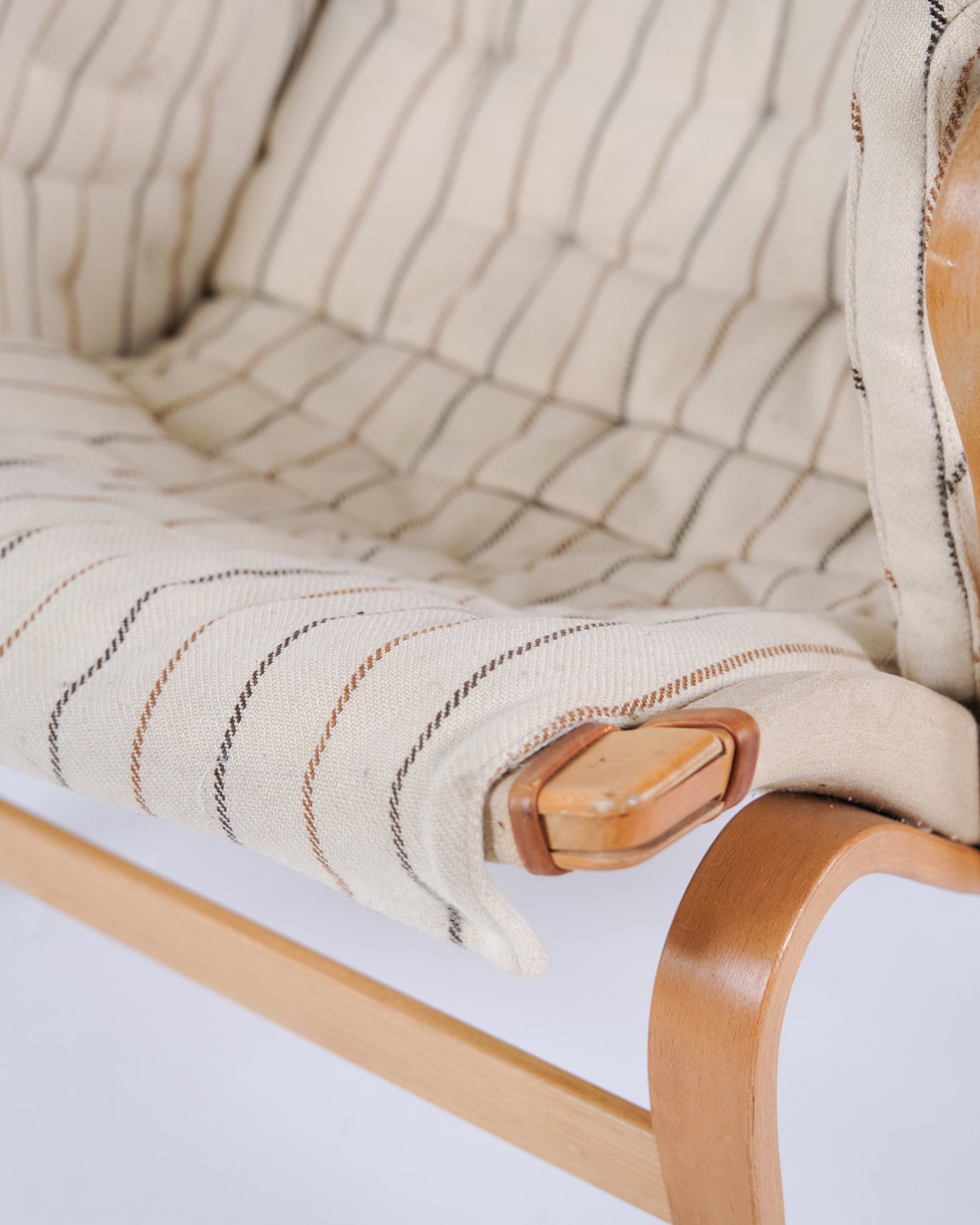 Bruno Mathsson Pernilla armchair model 69 from DUX in striped fabric and beech wood. Classic Scandinavian design from the 1960s.