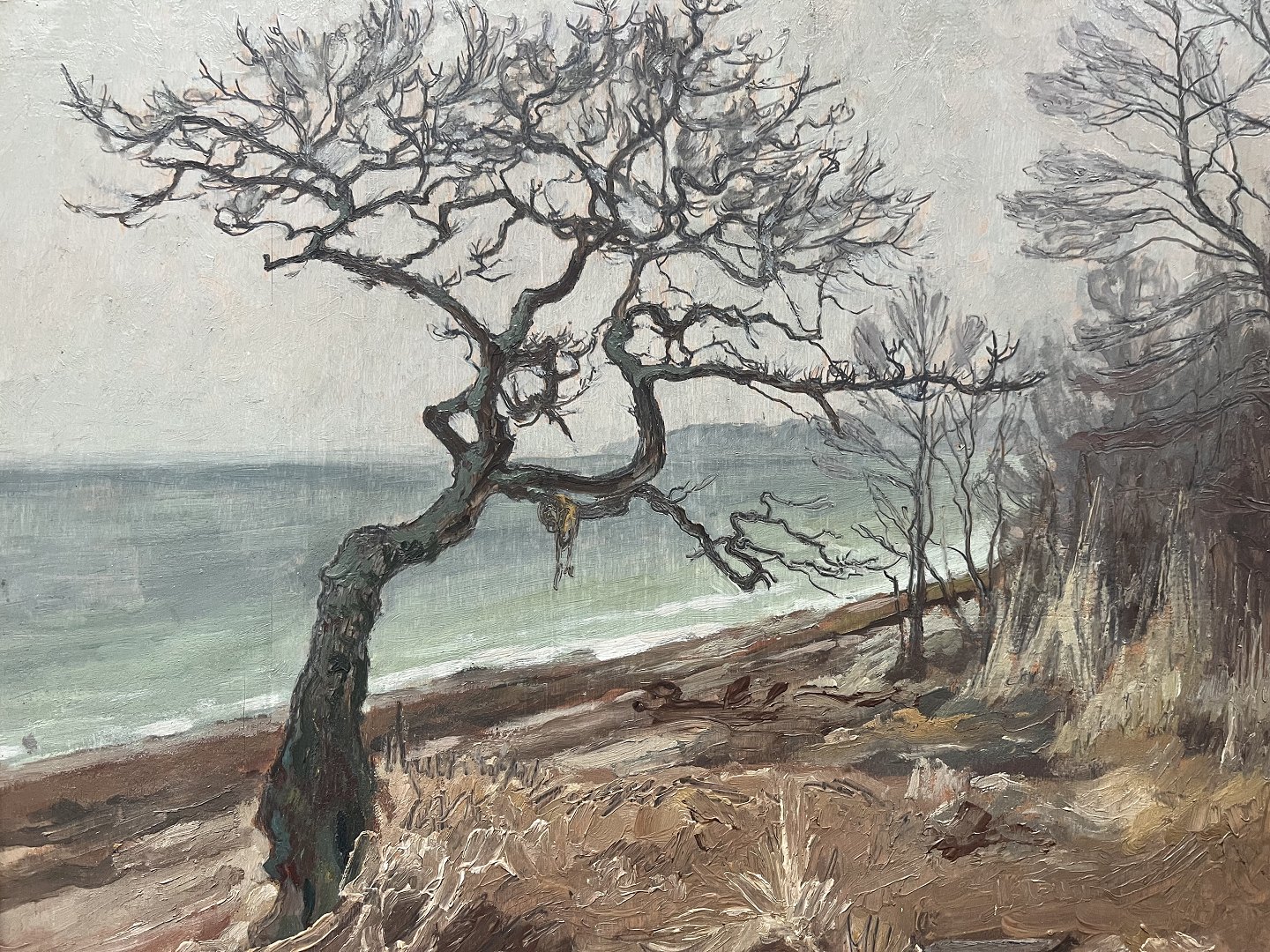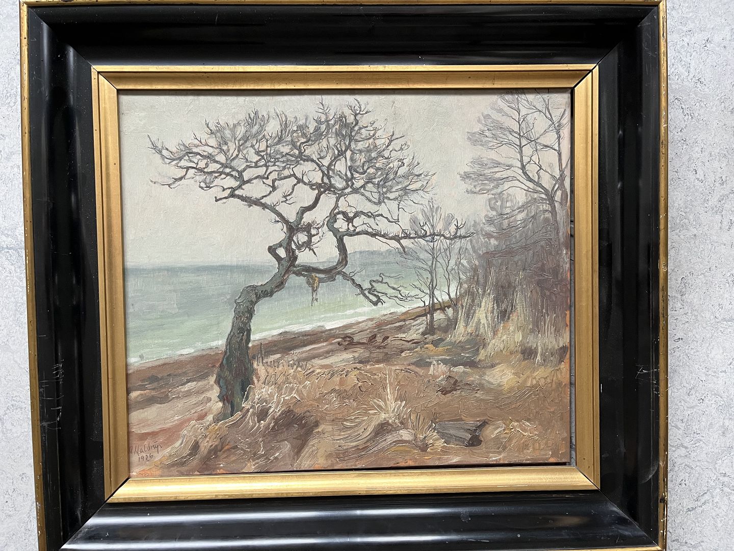 Maleri af Aksel Haldrup 1926 - Nøgent træ ved vandkant.