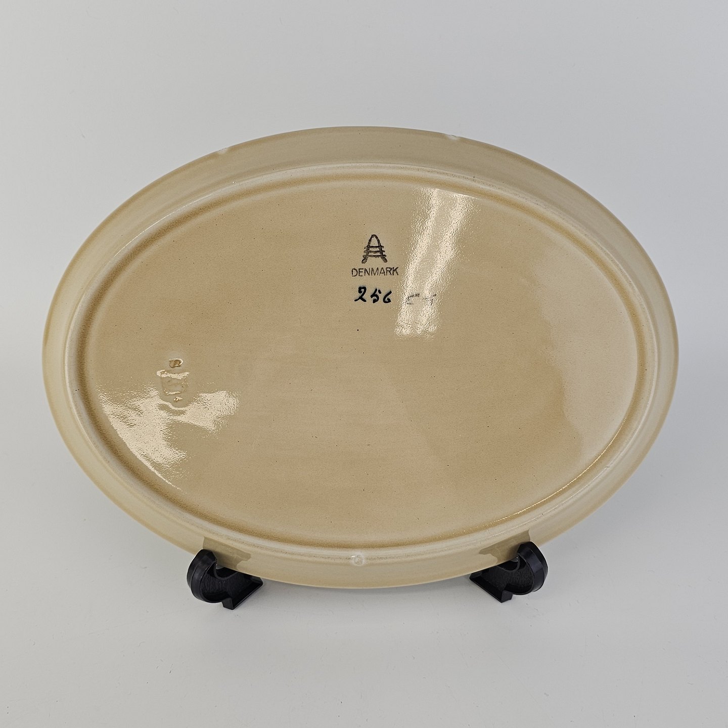 Aflangt ovalt fad i fajance fra stellet Dragsholm fremstillet i perioden 1934-1965.