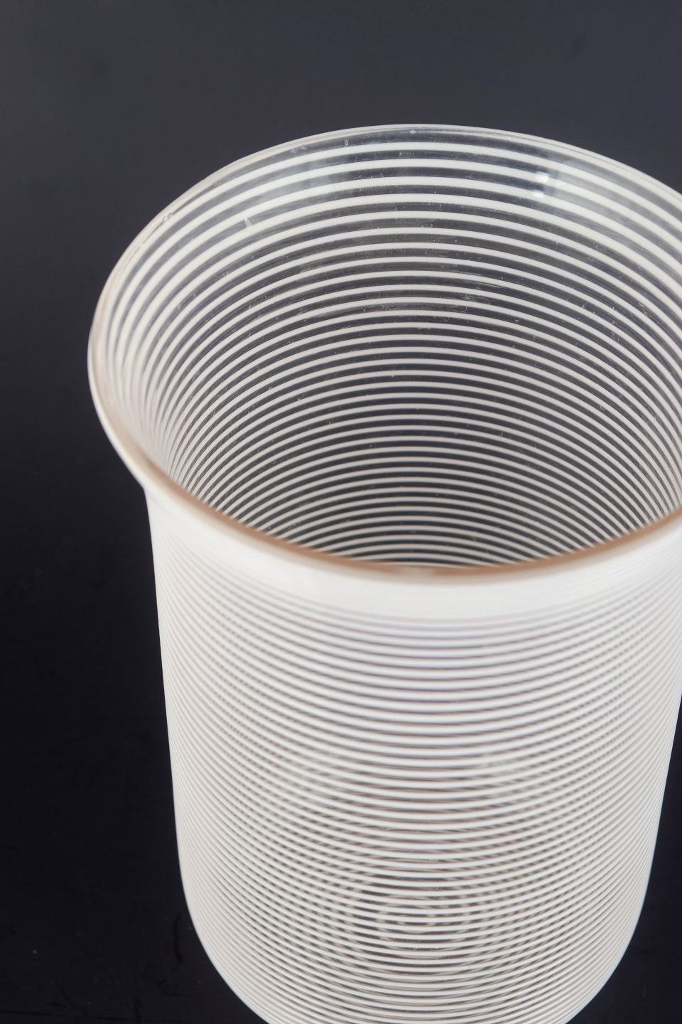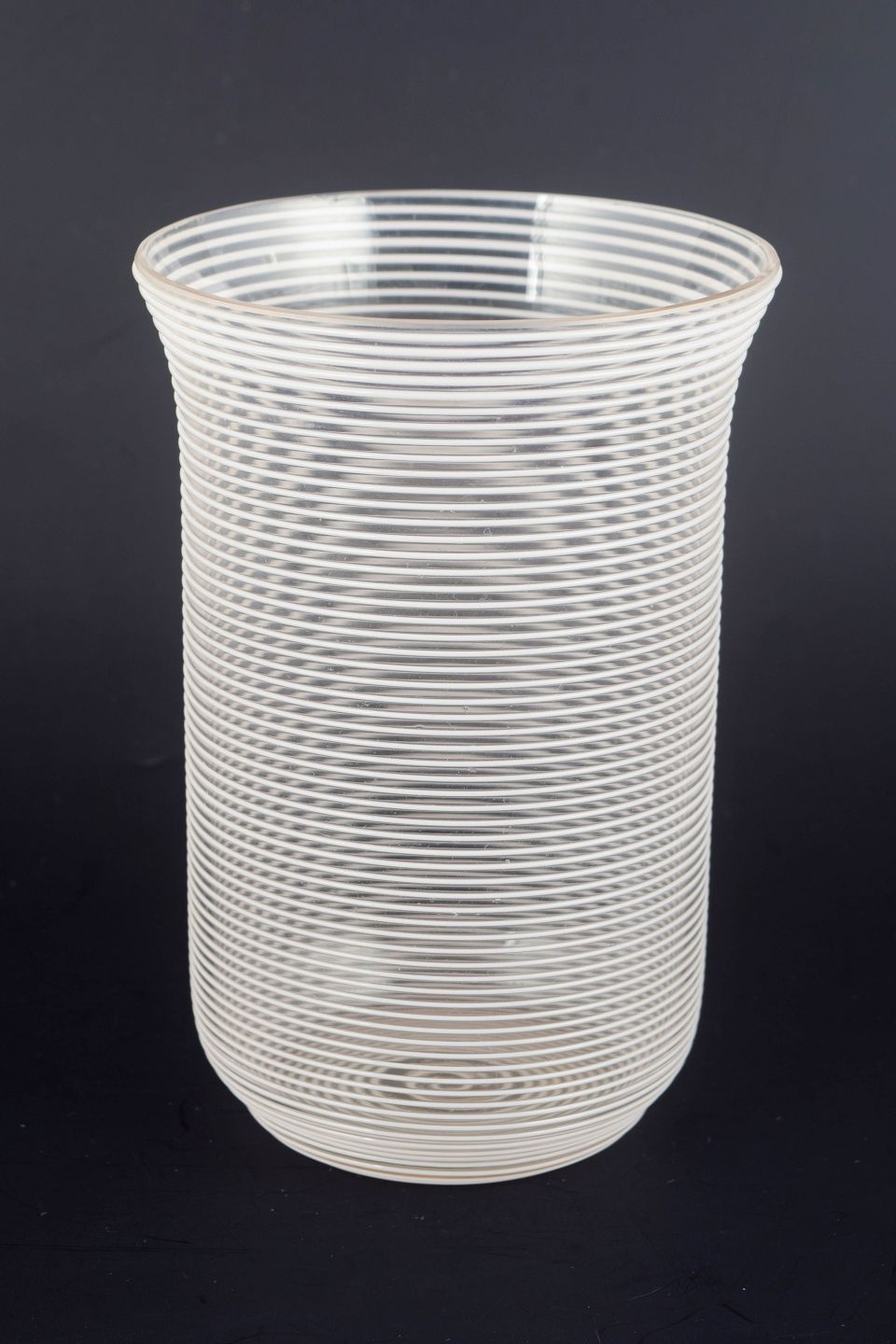 Cylinderformet kunstglasvase i klart glas med tætliggende horisontale tråddekorationer, der skaber en struktureret og optisk vibrerende overflade.