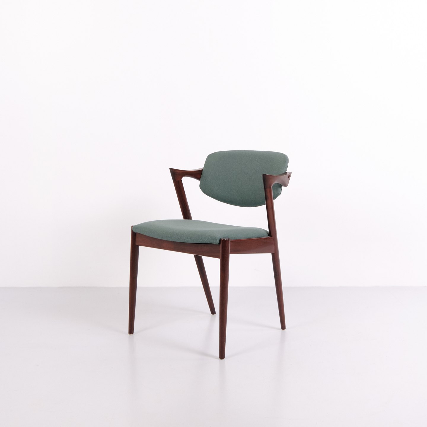 Sæt spisebordsstole, model 42, designet af Kai Kristiansen i 1960’erne. Stolene er udført i palisander og er kendetegnet ved deres elegante proportioner, skulpturelle ryg og karakteristiske danske snedkerdetaljer. Model 42 er et markant eksempel på dansk møbeldesign fra midten af det 20. århundrede.
