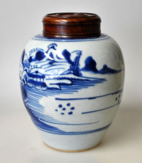 Chinese porcelain bojan, 19th century. With bluish hand-painted landscape decorations. With wooden lid. Height with lid: 15 cm.