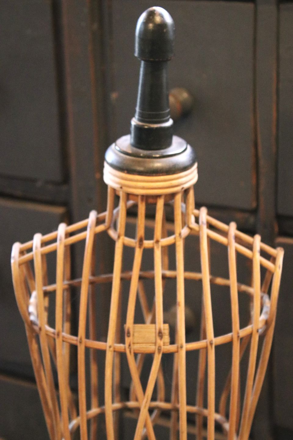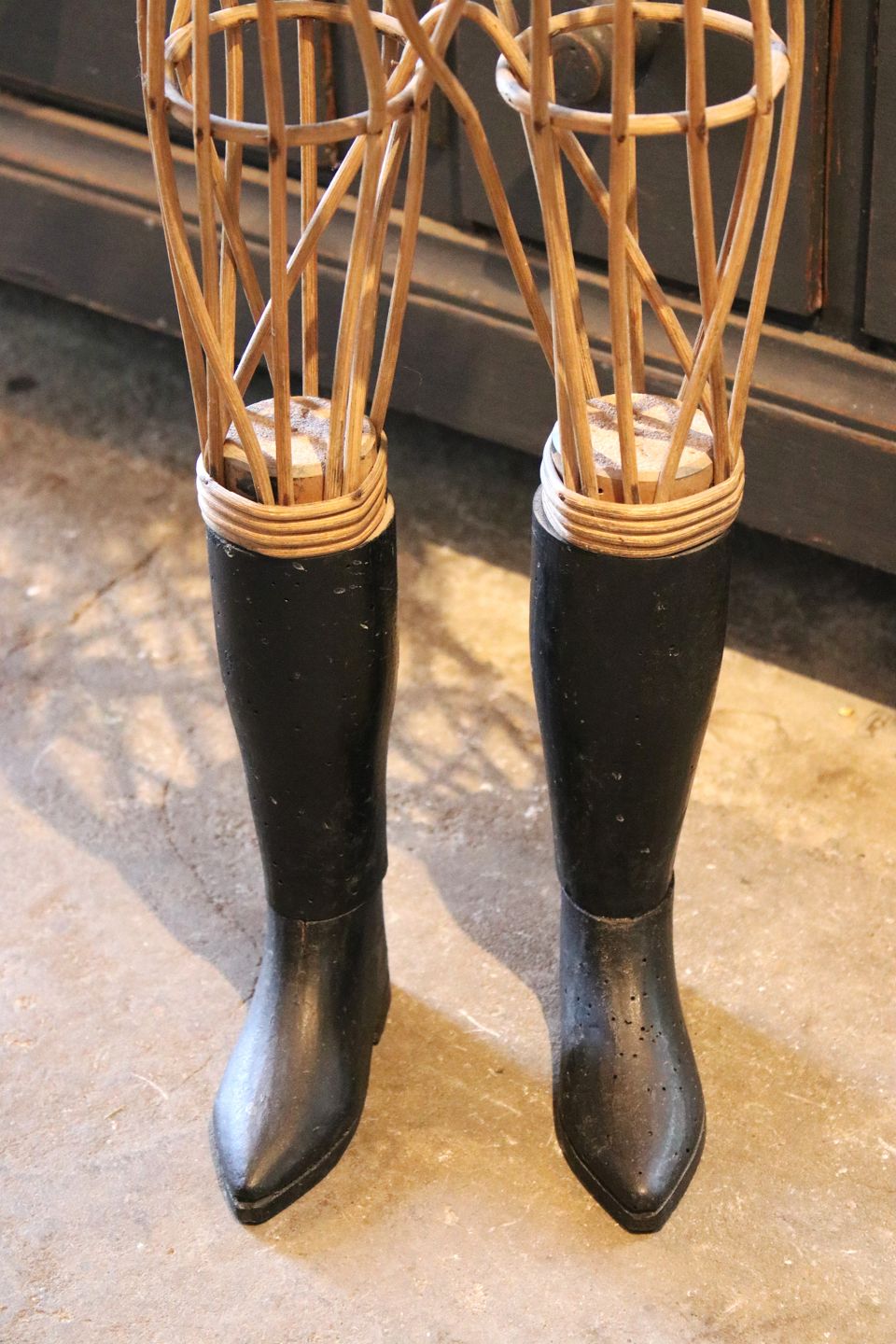 i flettet rattan med sorte træ støvler og med en fin patina.
