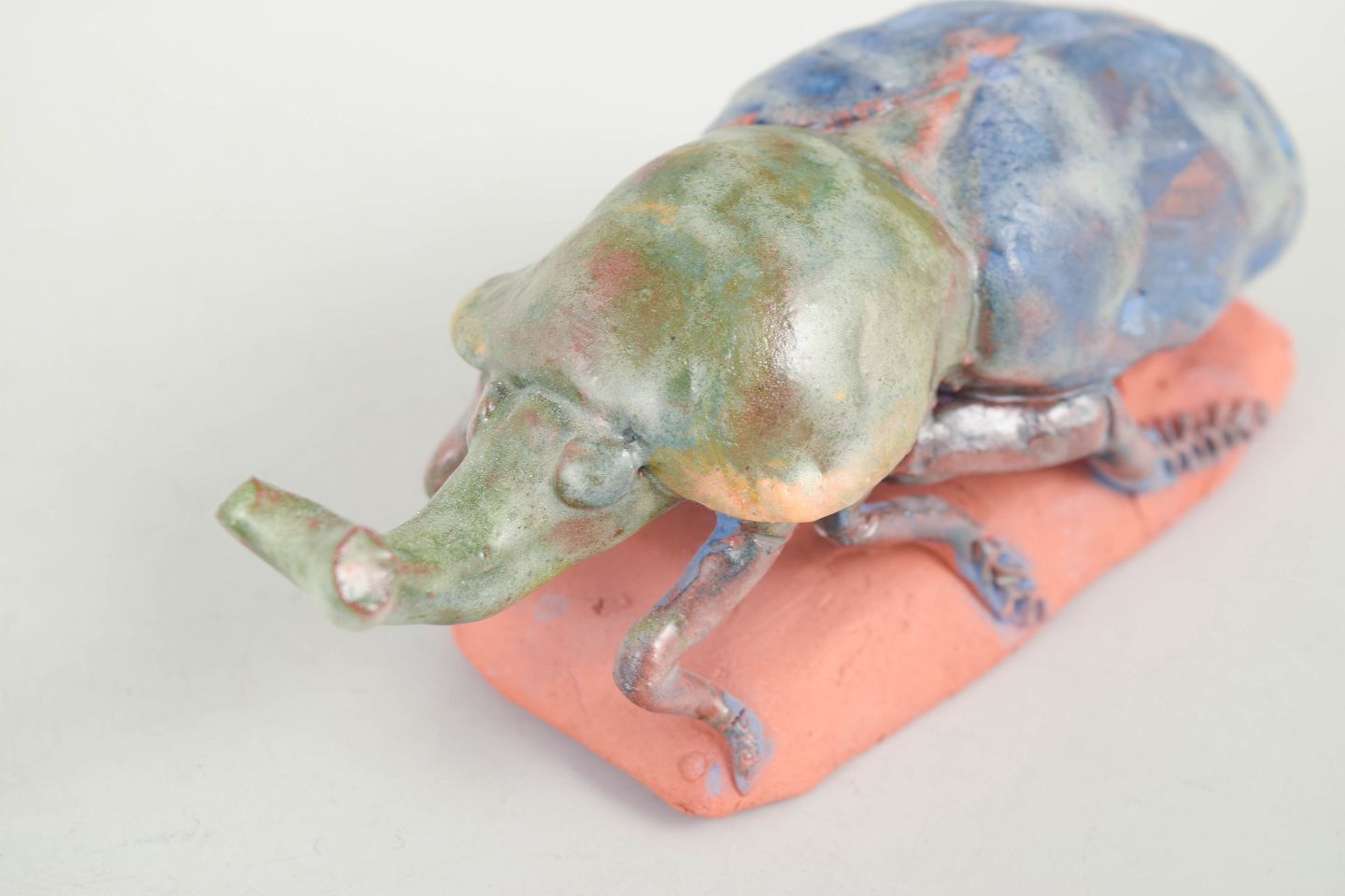 Unik keramisk figur forestillende et insekt udført i stentøj med flerfarvet glasur i grønne, blå og brunlige nuancer. Figuren er modelleret med naturalistiske detaljer og placeret på en lille base i ler, hvilket giver et skulpturelt og levende udtryk. Signeret og dateret 1978.