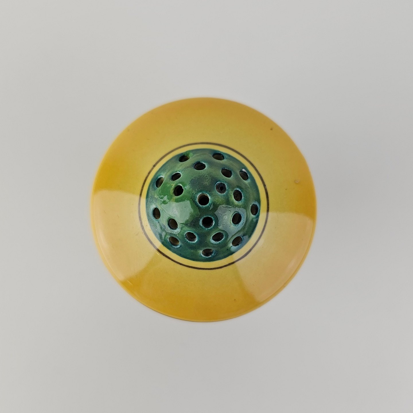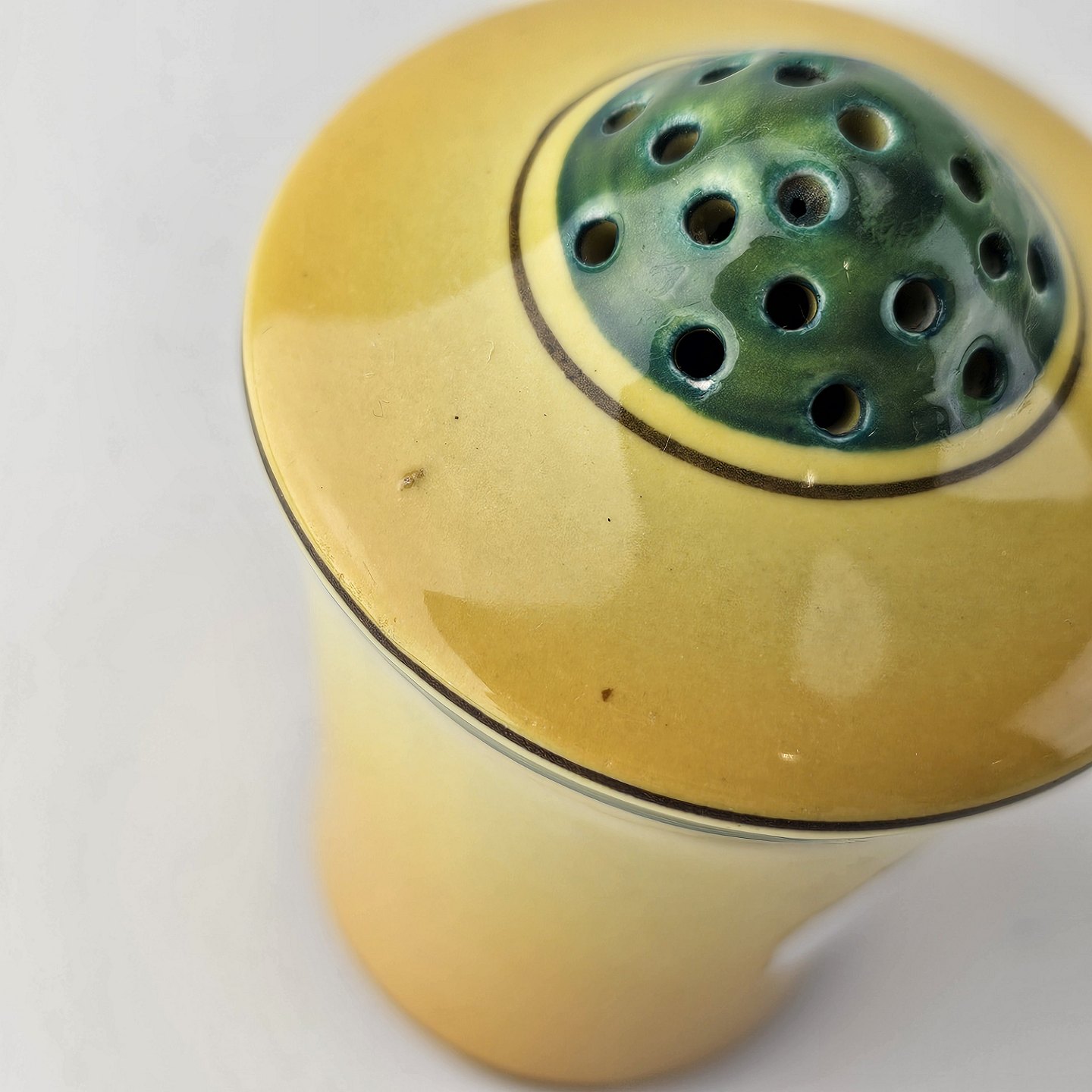 Fremstår med en nist i glasuren ved strøhullerne