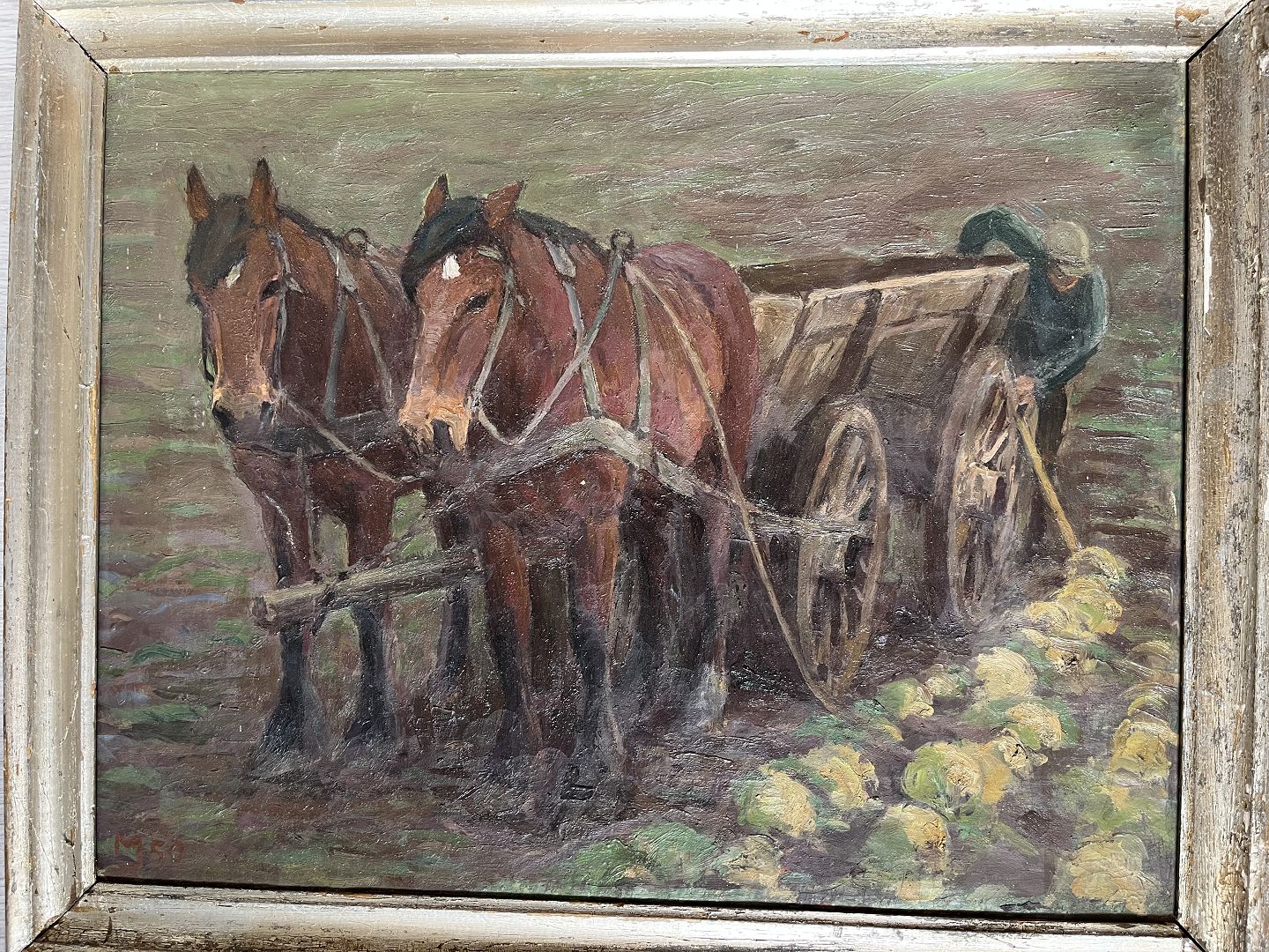 Maleri af Marius Jensen Hindevad - Kål høsten bringes i hus 1950