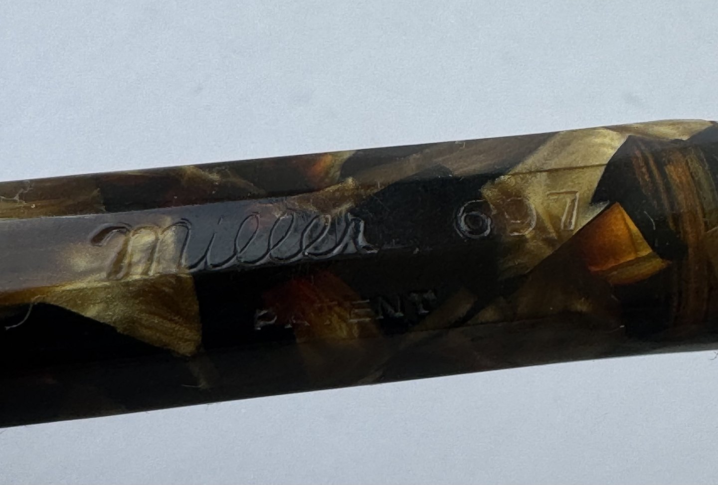 REN ART DECO STIL: 10 kantet og grøn marmoreret Miller nr. 697 fyldepen fra omkring 1940. I god stand uden skader eller reparationer. Alle dele originale til denne model inklusive en 14 karats guldspids (ca. 0,30 gram). Ny gummisæk skal indsættes før den igen kan optage blæk og skrive påny. Ny gummisæk kan indsættes for et tillæg på kr. 250,00. Fyldepennen er 12,3 cm lang.