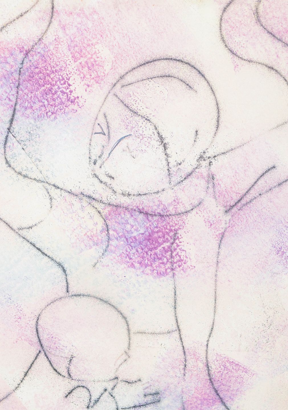 Figurative composition depicting a mother and child executed in pastel on paper, dated 1973. The work is characterised by a loose expressive line combined with soft fields of pink and violet colour.