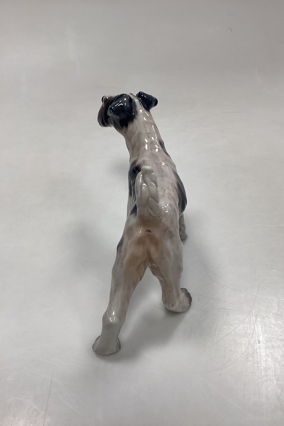 Dahl Jensen Figur - Ruhåret Foxterrier No. 1009. Beigebrun med mørke aftegninger. 2. Sortering med lille sort plet på ryggen.