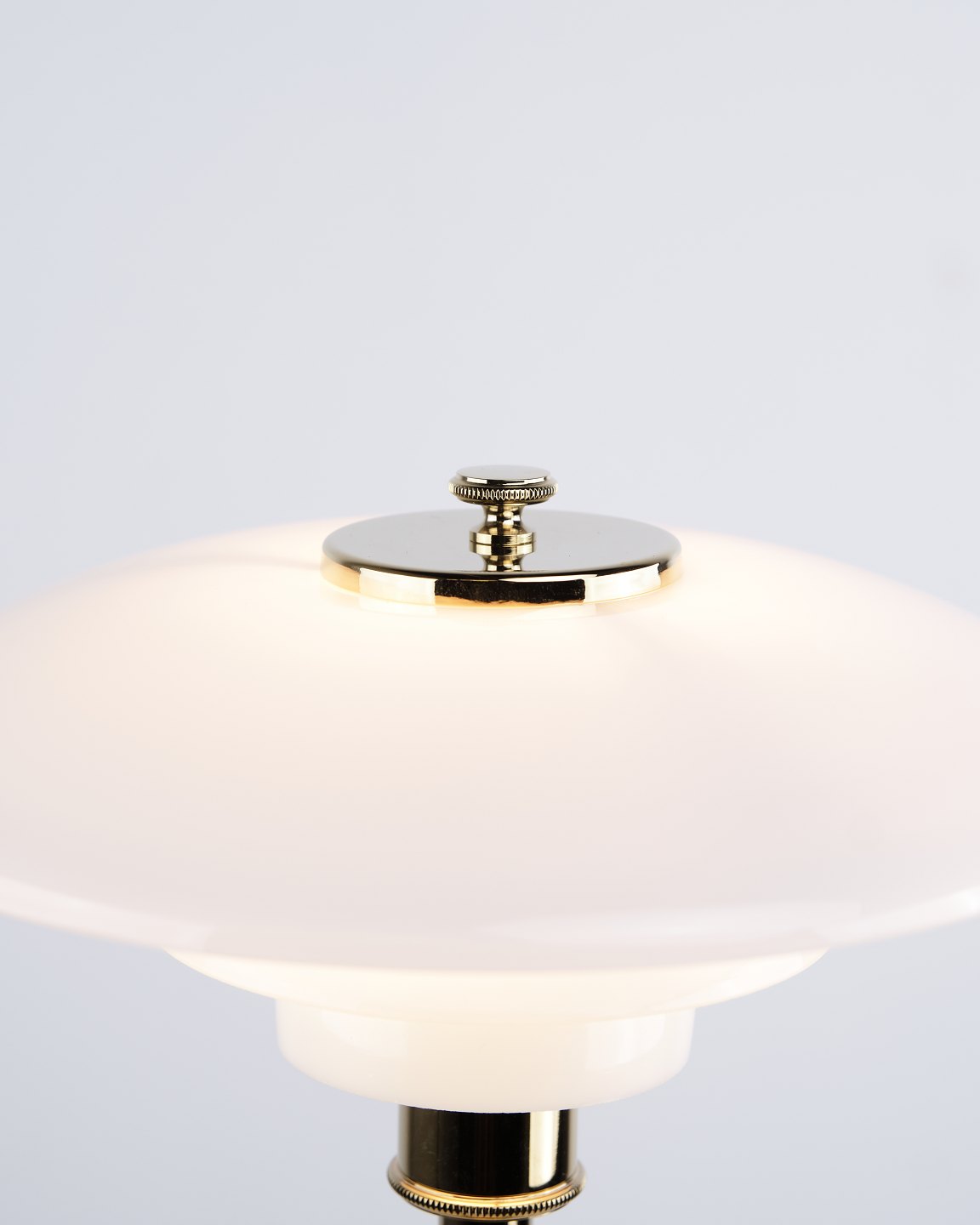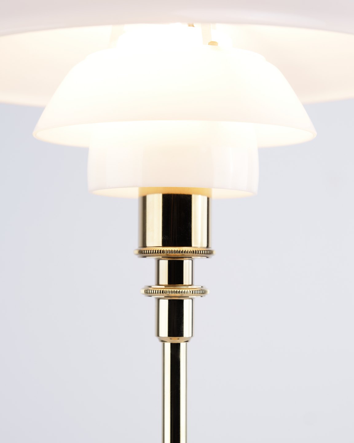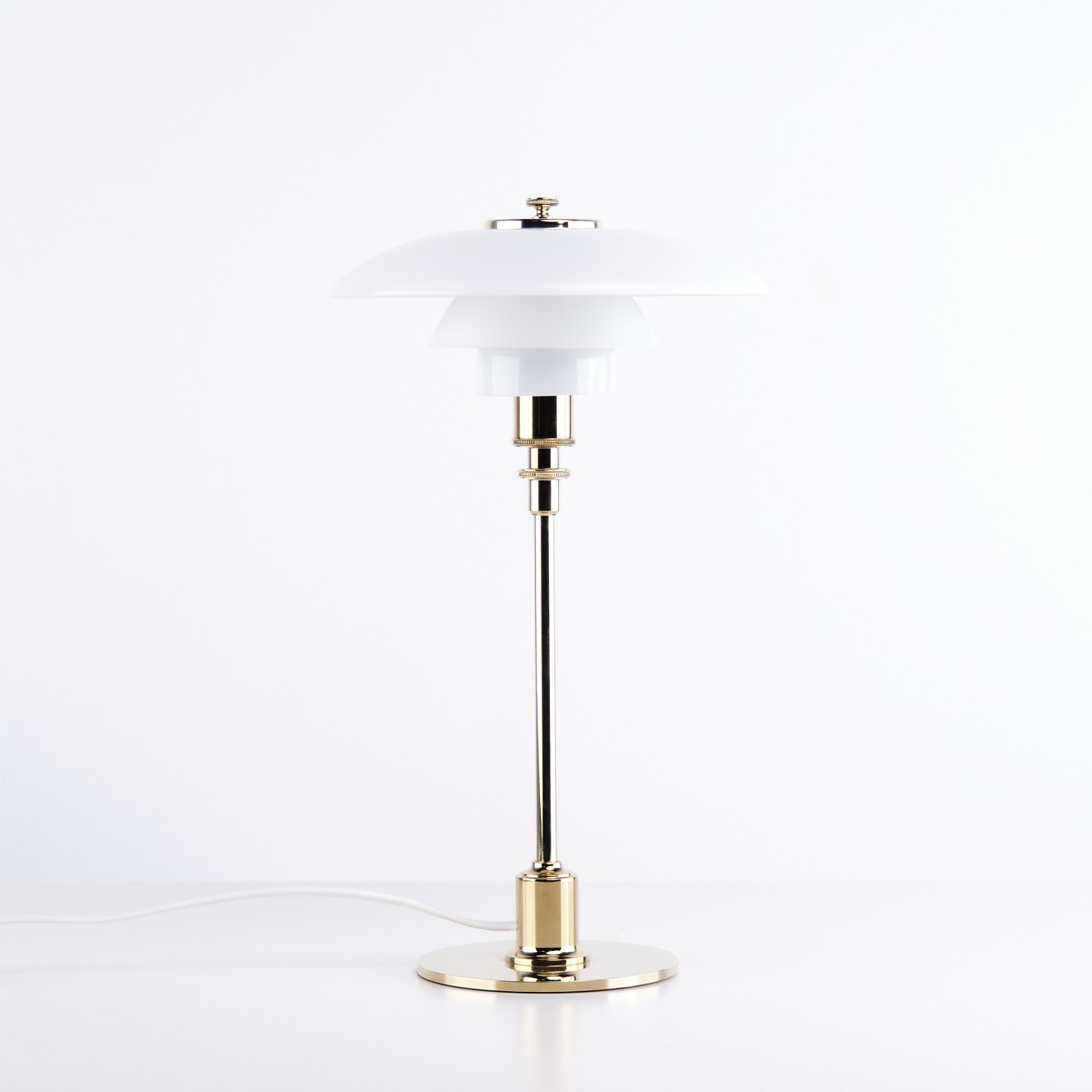 PH 2/1 bordlampe designet af Poul Henningsen og introduceret i denne version af Louis Poulsen i 2019. Lampen er udført med fod i messing og skærme i hvidt opalglas, som giver et blødt og behageligt lys. Det ikoniske treskærmssystem er udviklet til at sikre optimal lysfordeling og minimere blænding.