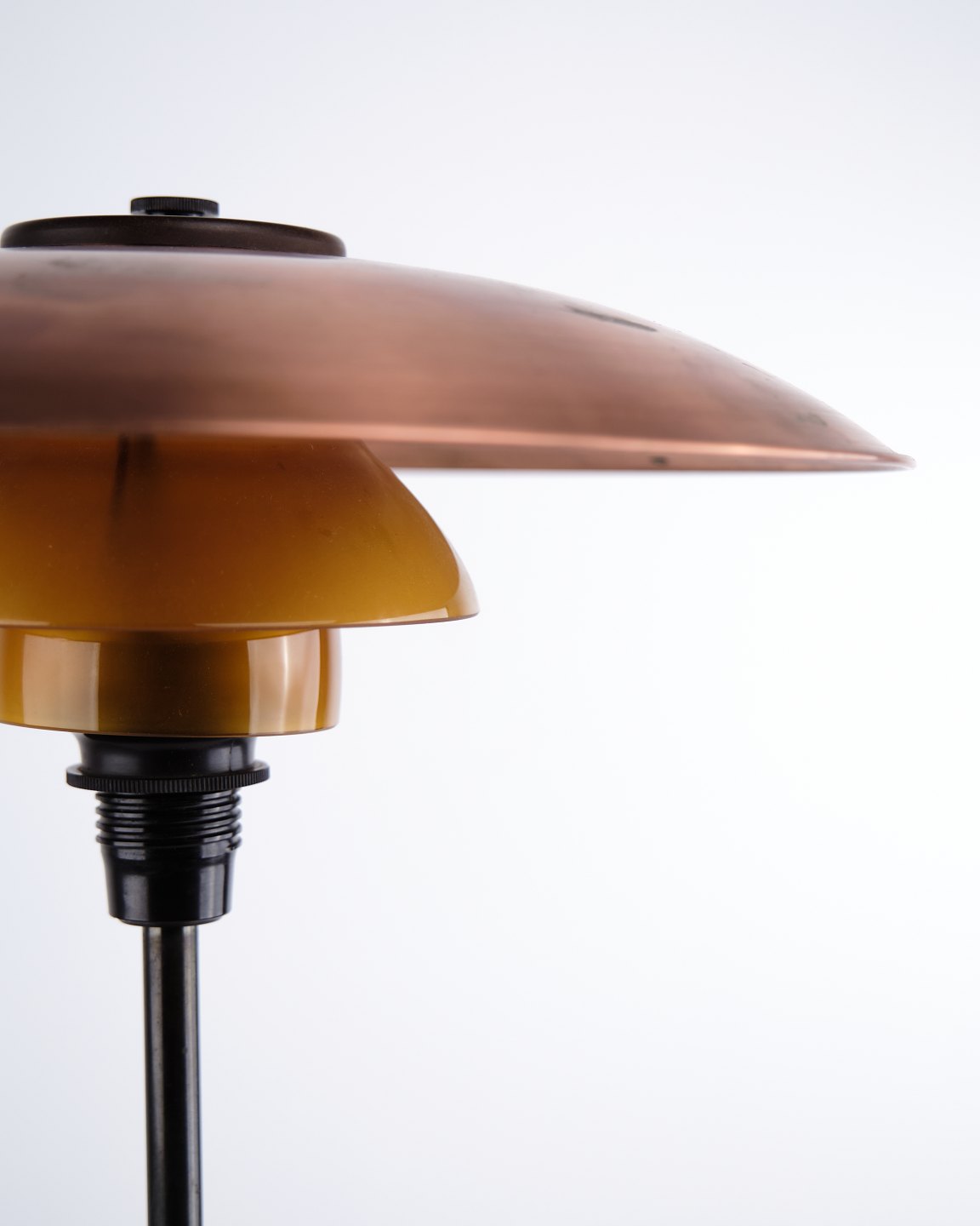 PH 3,5/2 bordlampe designet af Poul Henningsen og fremstillet af Louis Poulsen i 1930’erne. Lampen er udført med overskærm i kobber, ravfarvede glasskærme og fod i bruneret messing.