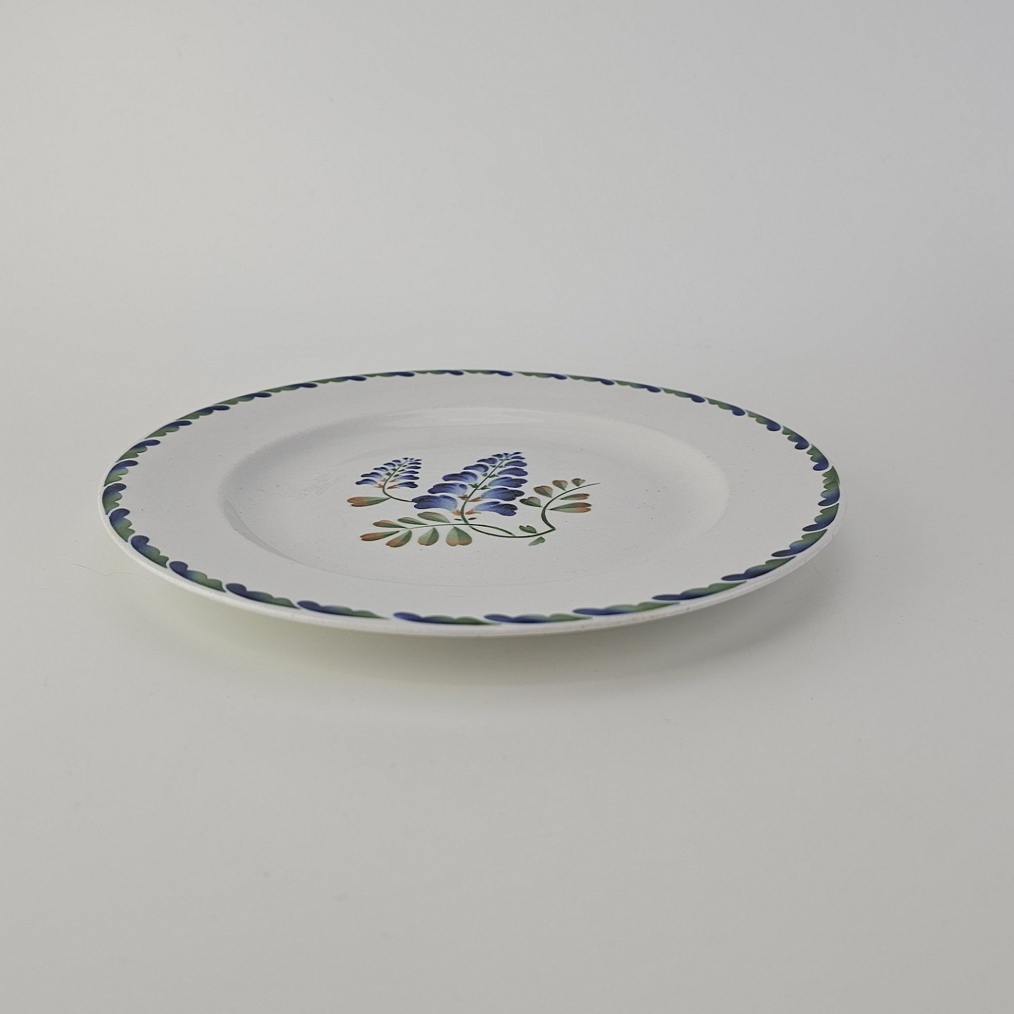 Taasinge er stel i hvid fajance med blomstermotiv og blå dekoration langs kanten, produceret 1931-39
