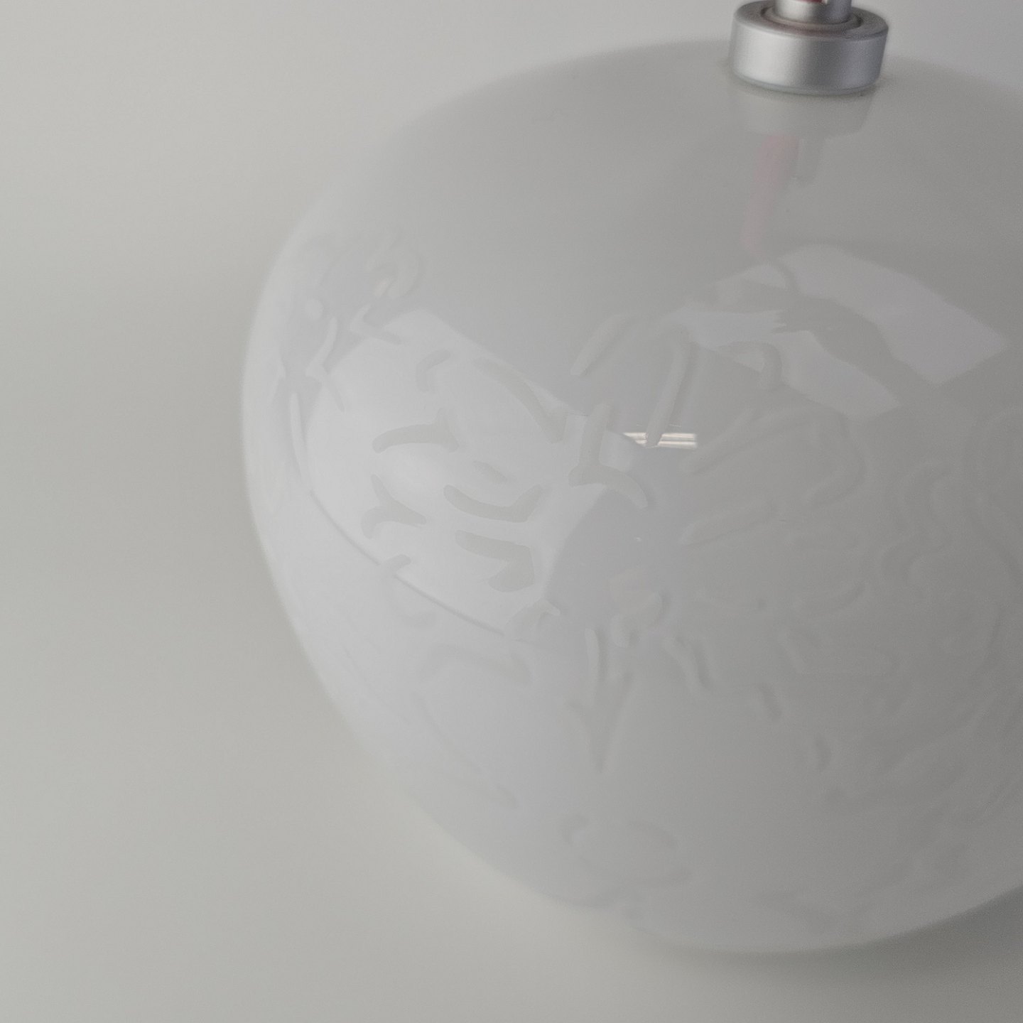 Pendel i hvidt mundblæst glas med blomstermotiver og monteret med lyserød ledning