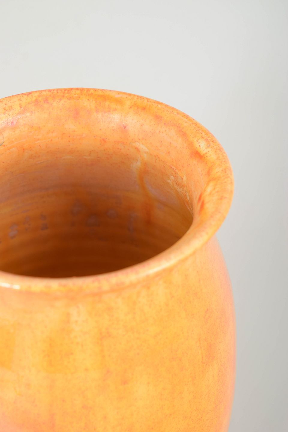 Elegant vase i glaseret lertøj med blød, let konisk form og svagt udadbøjet rand. Udført i lys gul glasur med varme orange nuancer og fine lodrette løb, der giver et levende og organisk udtryk. Signeret HAK i bunden.