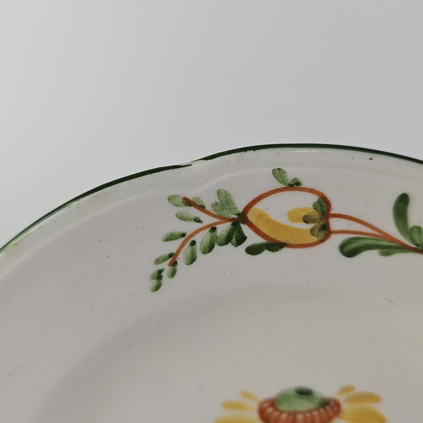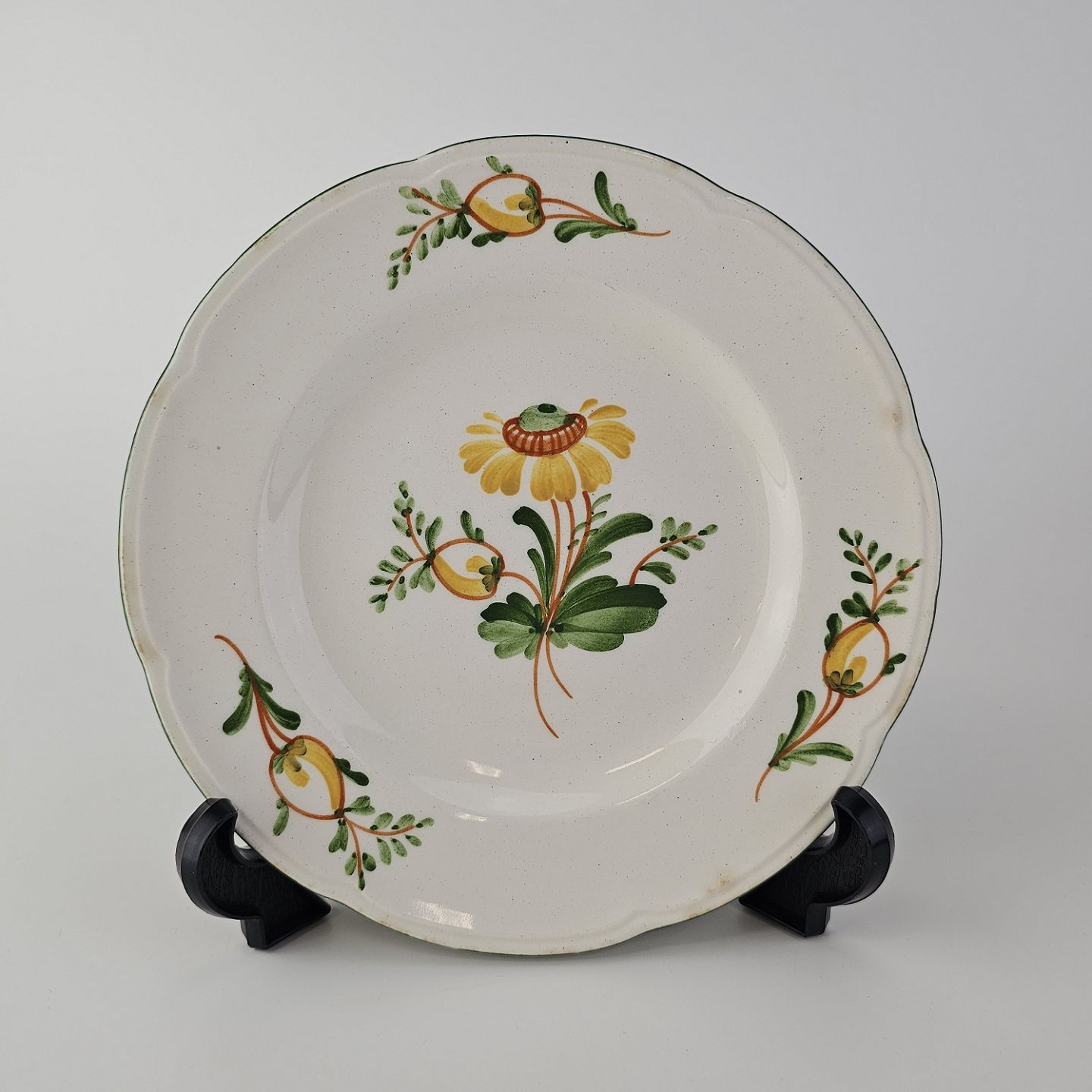 Hvidt fajancestel i stelform Feston/Alma med motiv af gule blomster og grønne blade.