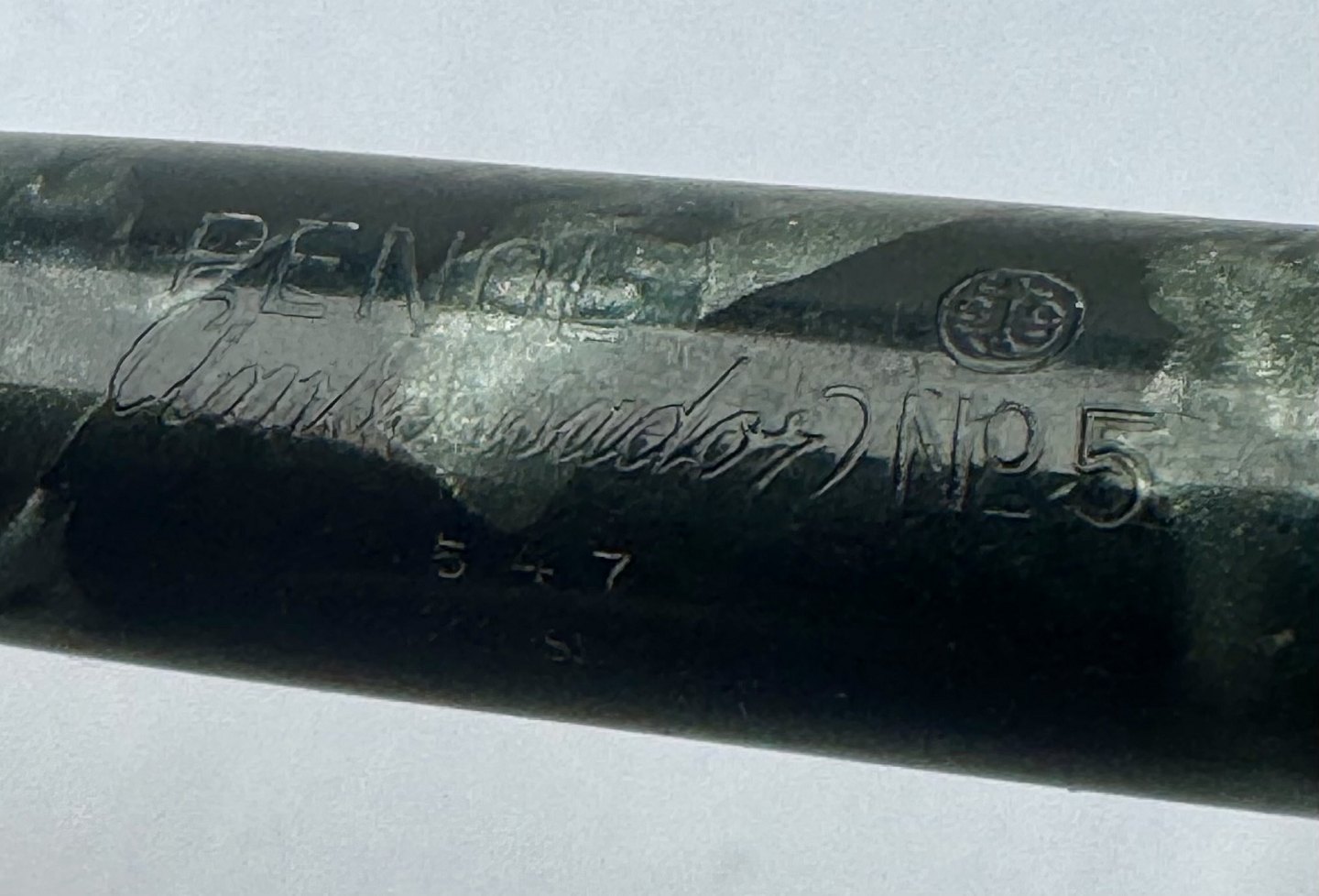 Blue marbled Penol Ambassador no. 5 fountain pen. Push button filler. A new rubber sack must be inserted before it can absorb ink and write again. All parts are original to this model. No damage or repairs. However, the “button” on the small black short bottom screw is missing, which is why there is a hole - see photos. Length 13 cm
