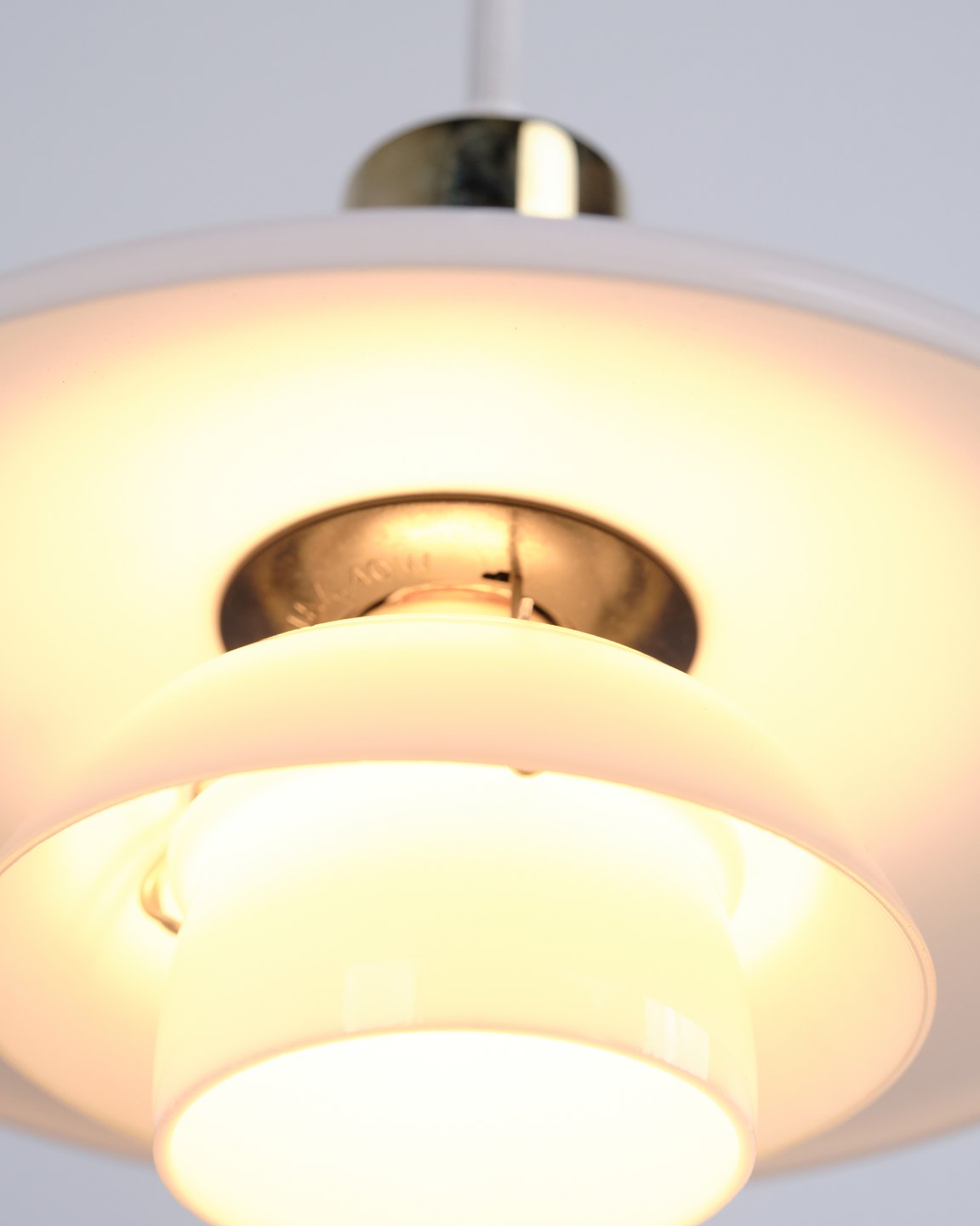PH 2/1 pendel i messing med opalglas fra Louis Poulsen. Designet af Poul Henningsen med klassisk dansk lysdesign og blændfri belysning.