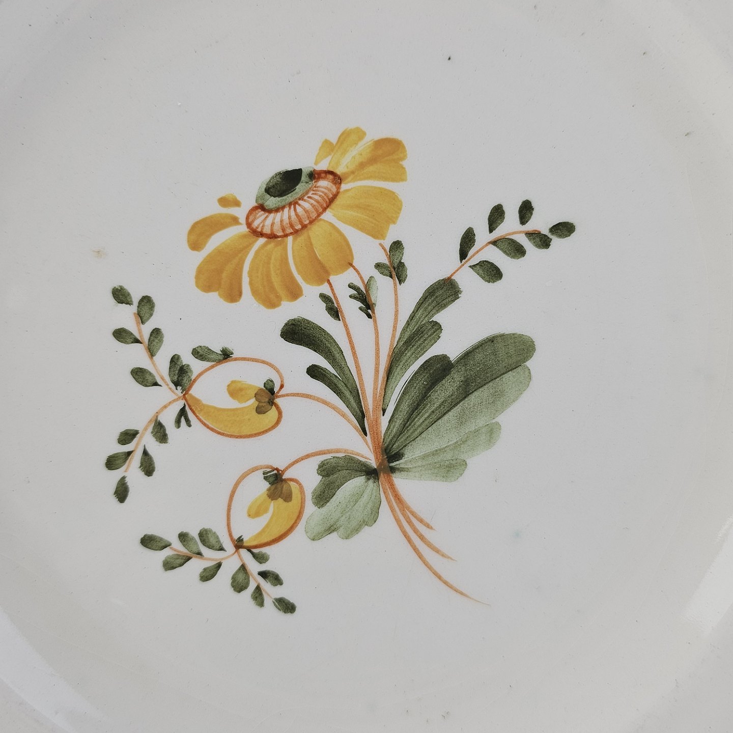 Hvidt fajancestel i stelform Feston/Alma med motiv af gule blomster og grønne blade.