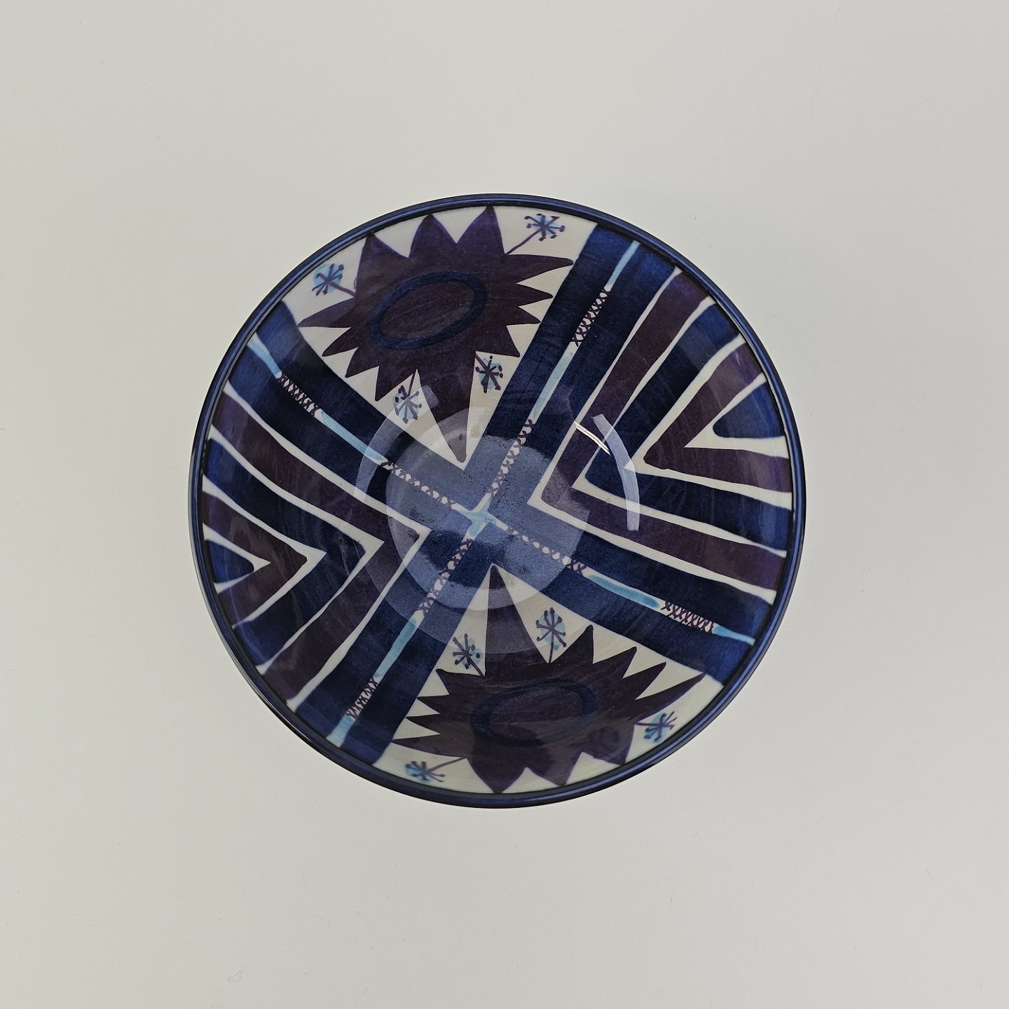 Mørkeblå Tenera skål dekoreret indvendigt med blå farver på hvid baggrund