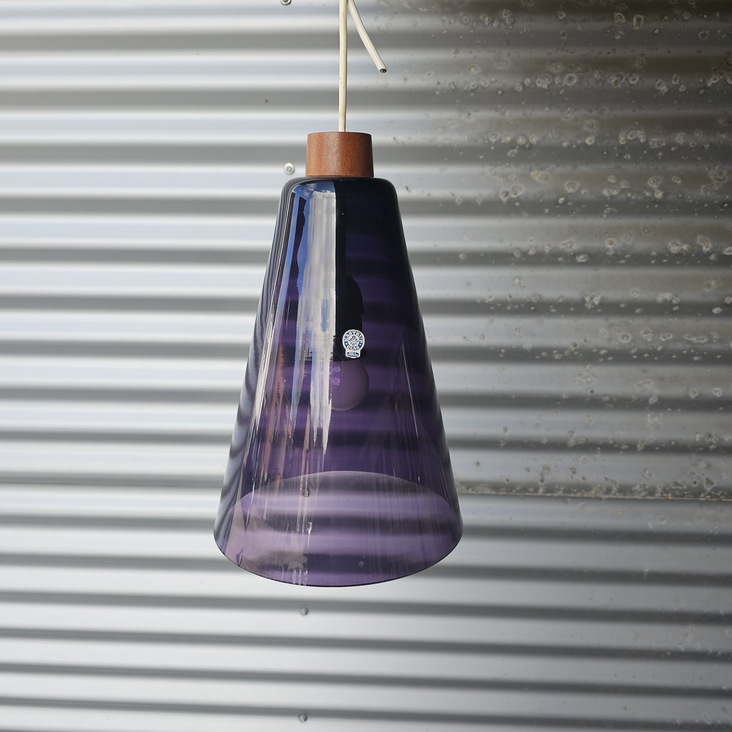 Sæt af to pendler i lilla glas med montering i teaktræ