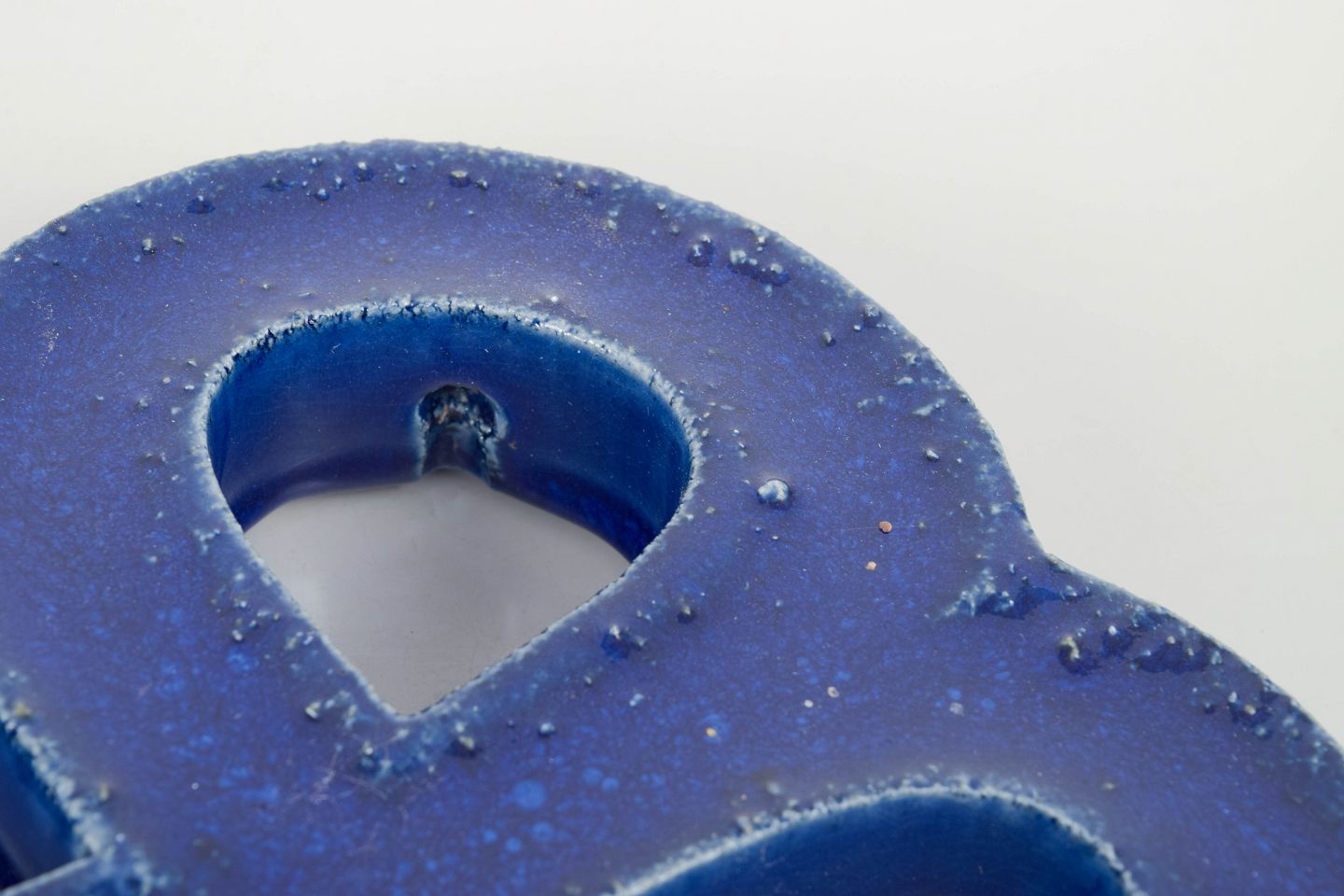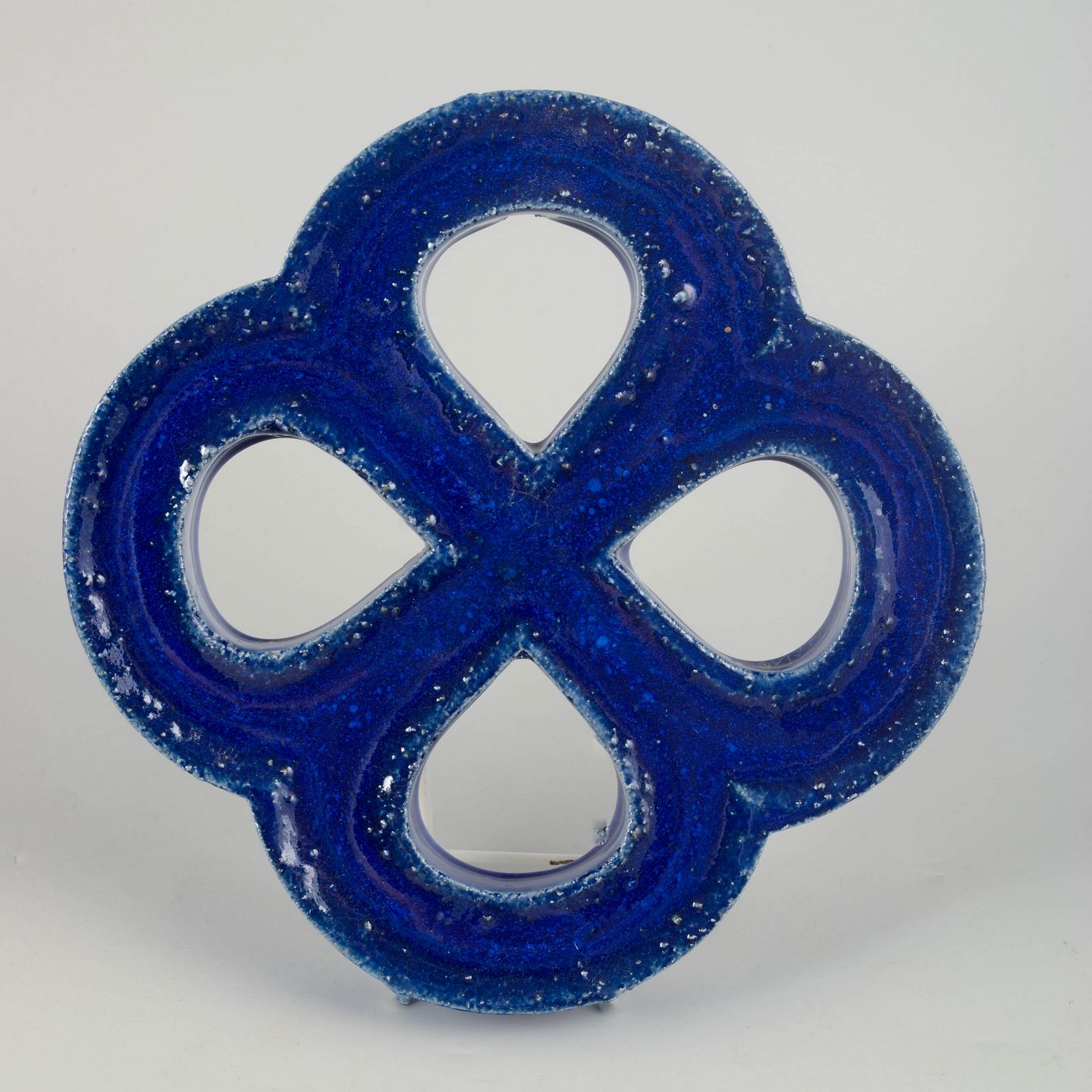 Dekorativt vægrelief i stentøj med organisk firkløverform og gennemgående åbninger. Udført med dyb blå, levende glasur med bobleeffekt og variation i overfladen. Bagside med hul til ophæng.