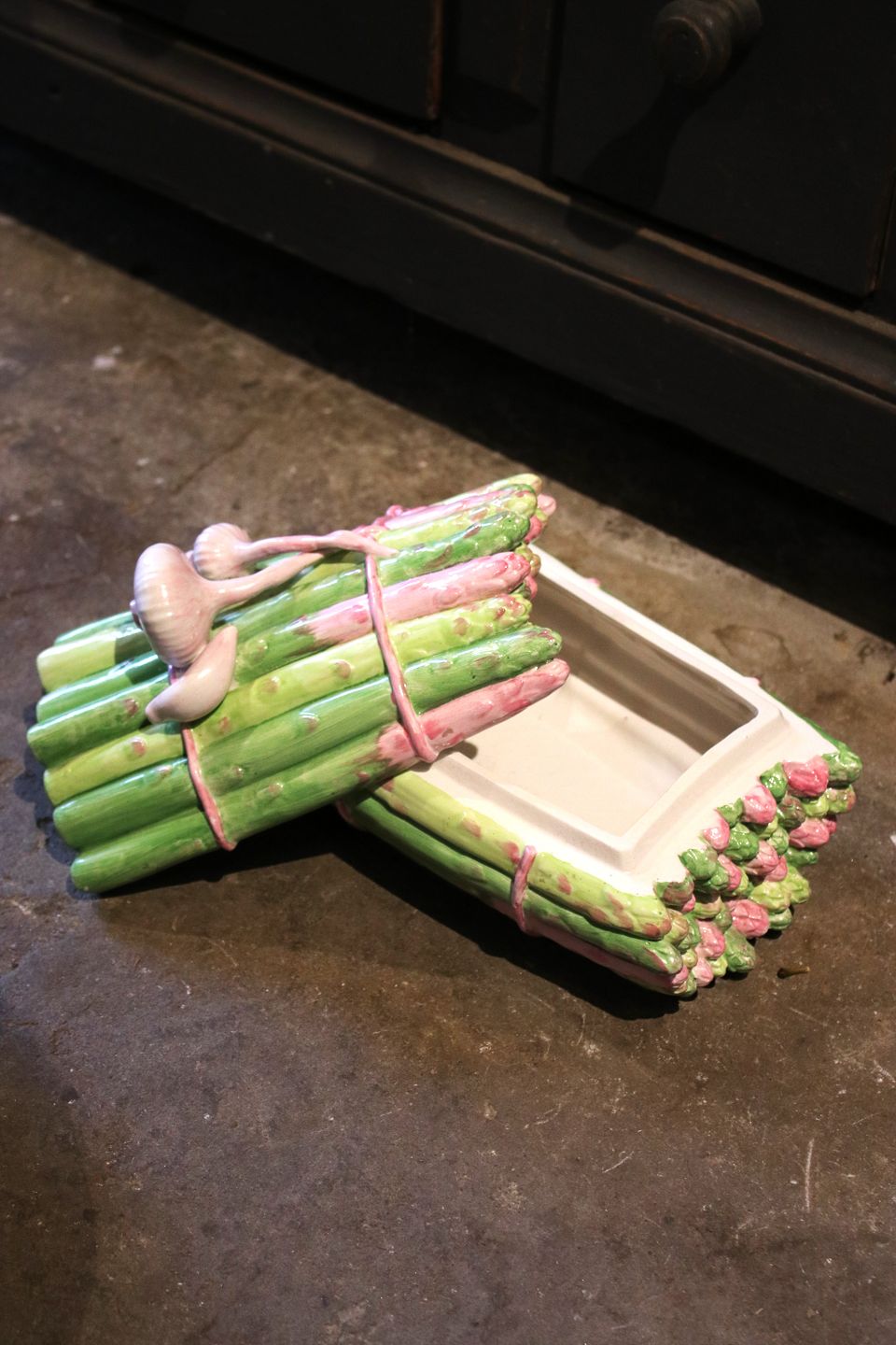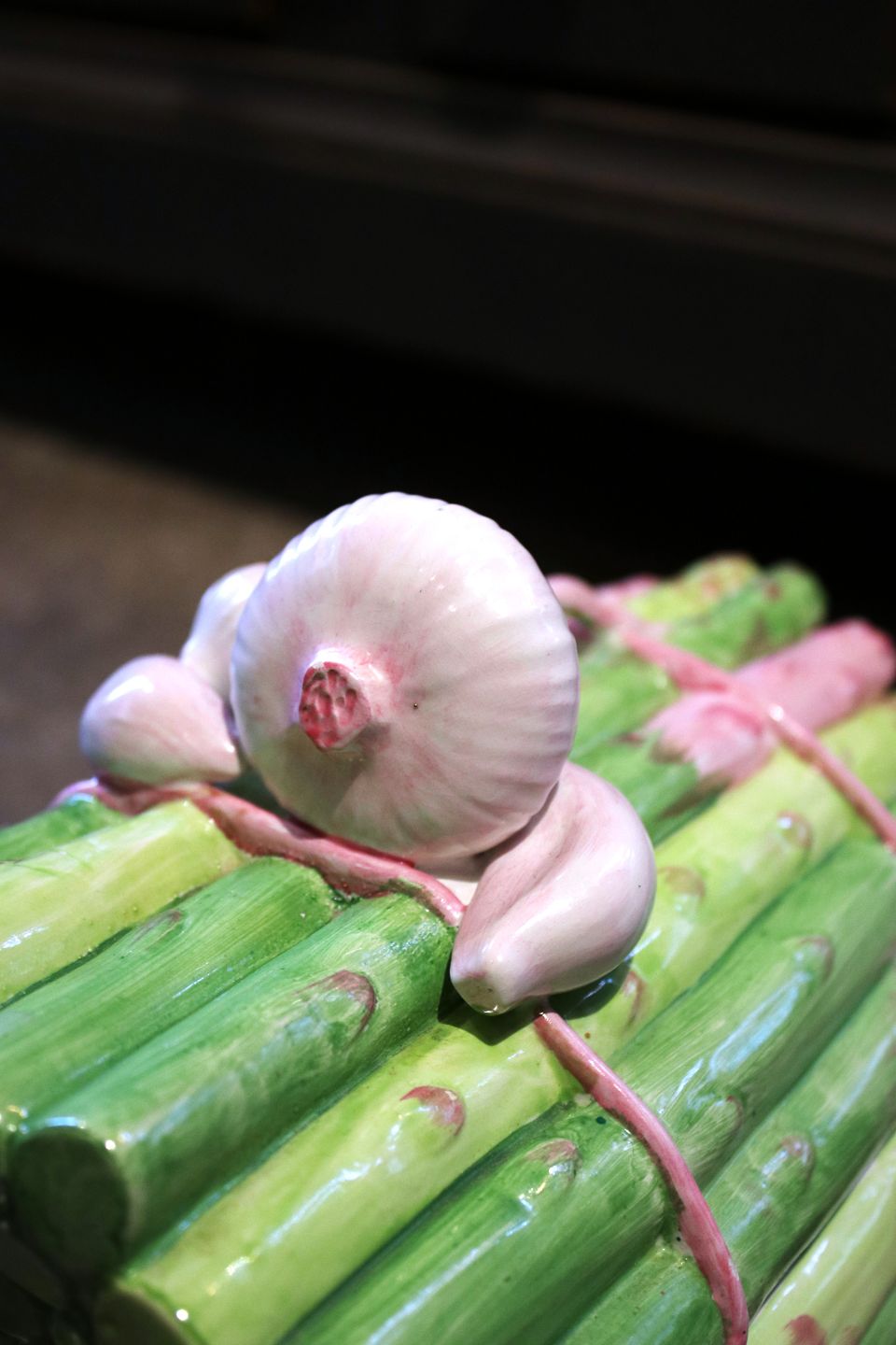 Gammel , italiensk fajance låg krukke i form af et bundt asparges med hvidløg på toppen. H:18cm. L: 24cm. B: 16,5cm.
