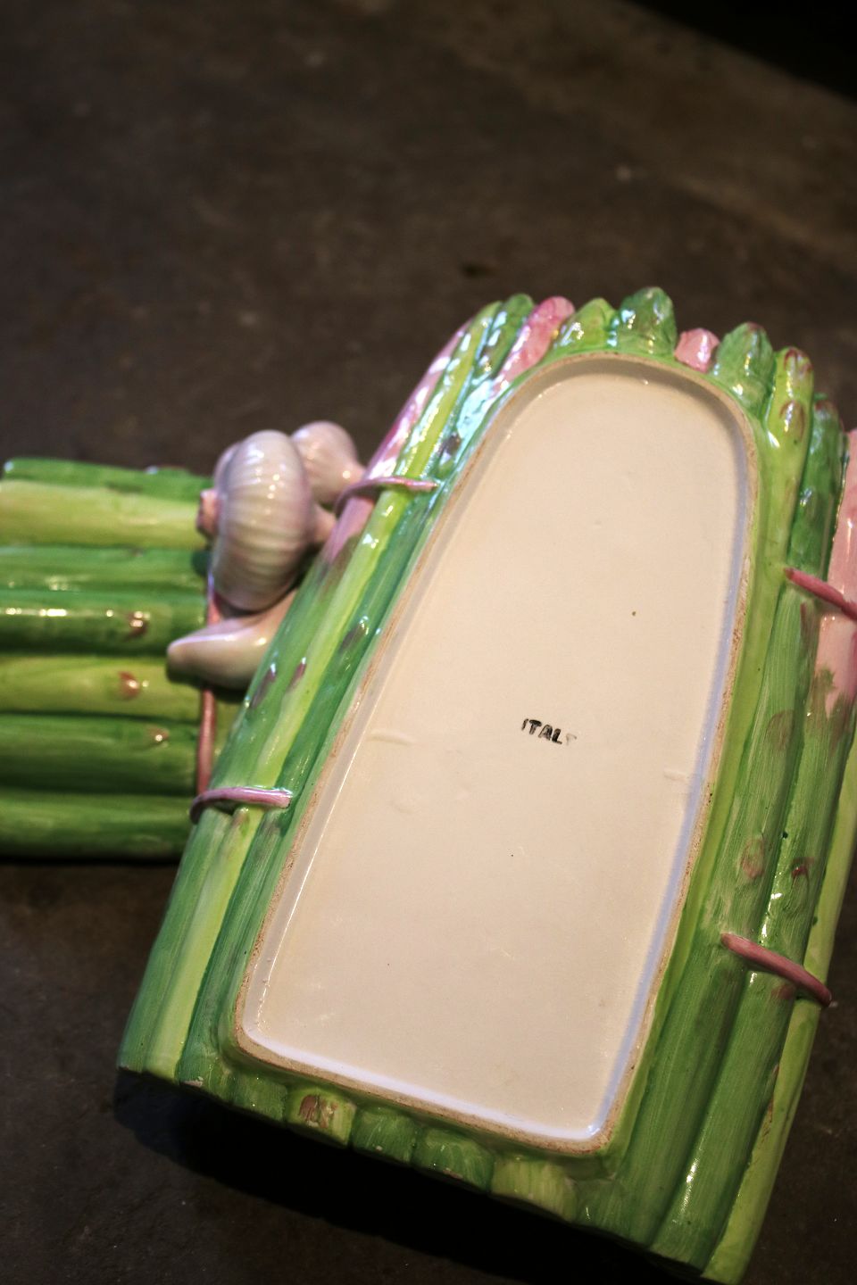 Gammel , italiensk fajance låg krukke i form af et bundt asparges med hvidløg på toppen...