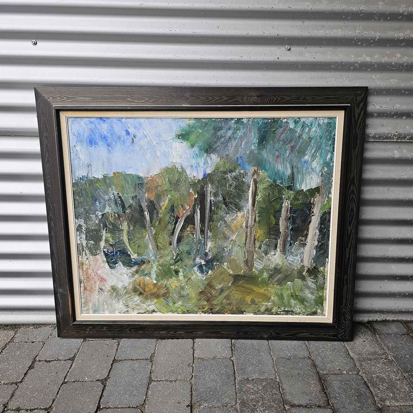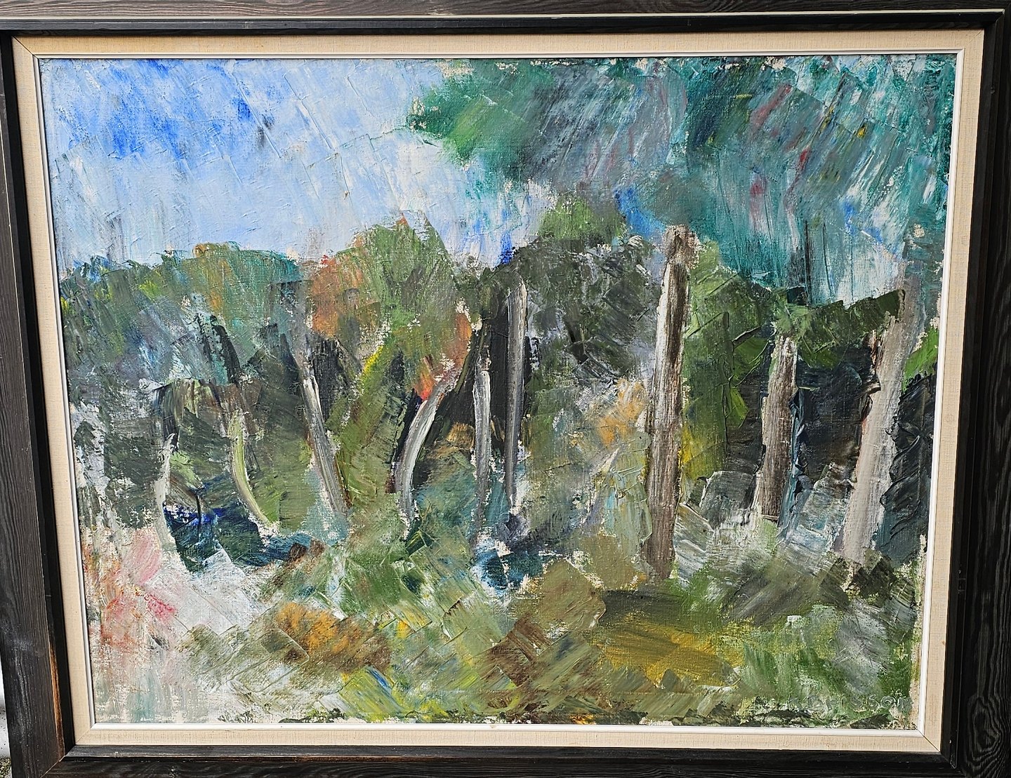 Oliemaleri på lærred med titlen Tisvilde Hegn. Monteret i sortmalet ramme med abstrakt naturmotiv, dateret 1960