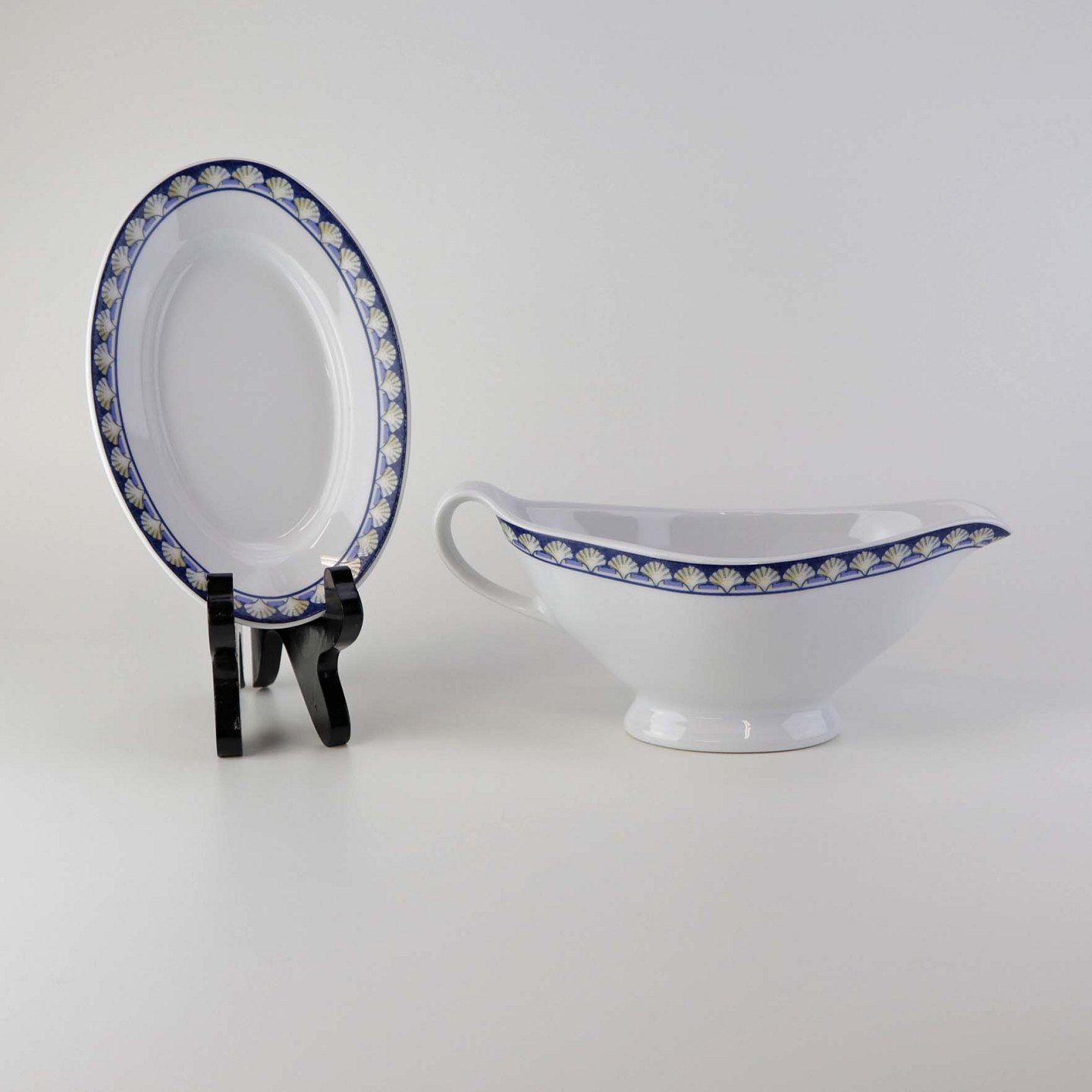 Service i glat hvid porcelæn med blåt bånd og dekoration af gule vifteformede strandskaller. Stellet kan gå i opvaskemaskinen.