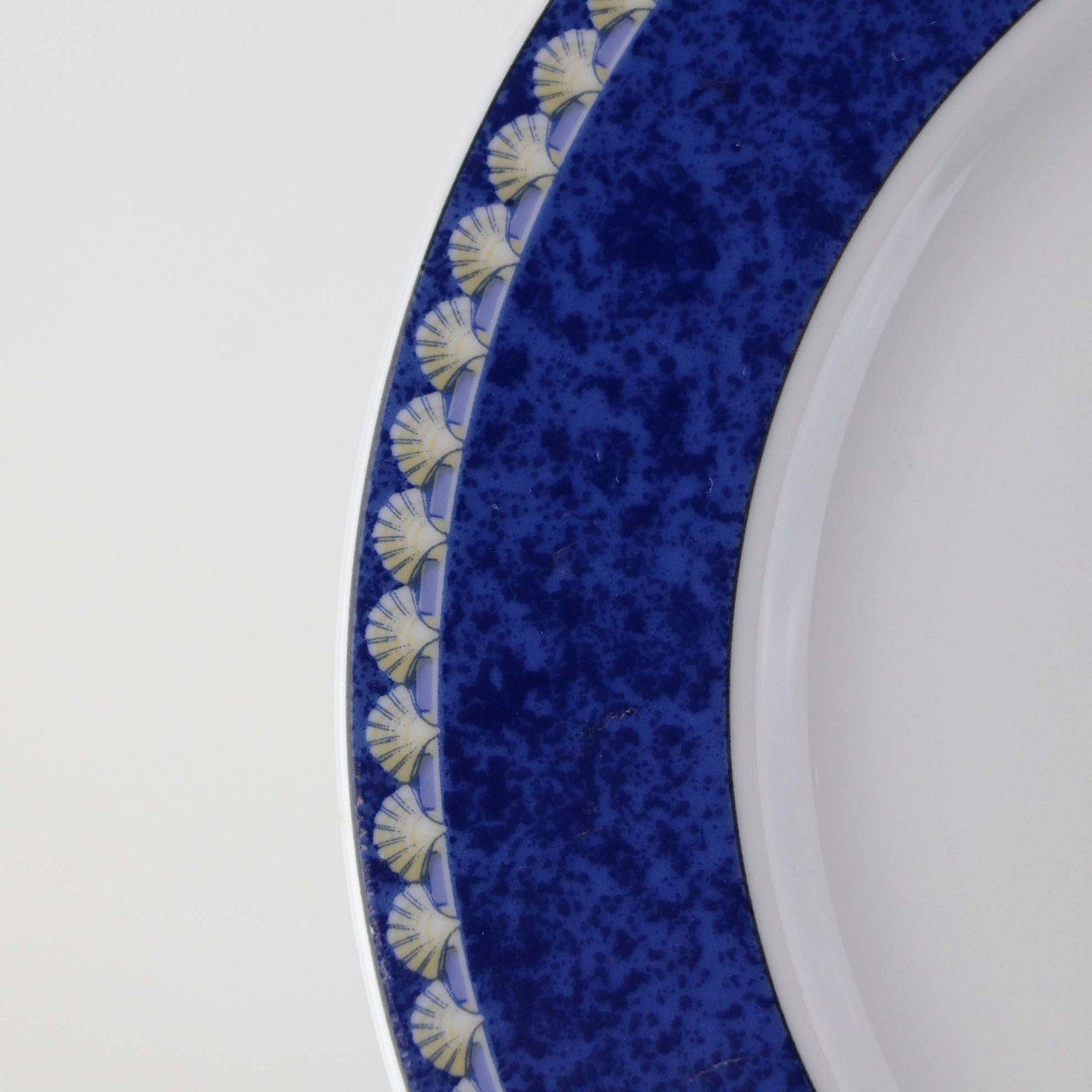 Service i glat hvid porcelæn med blåt bånd og dekoration af gule vifteformede strandskaller. Stellet kan gå i opvaskemaskinen.