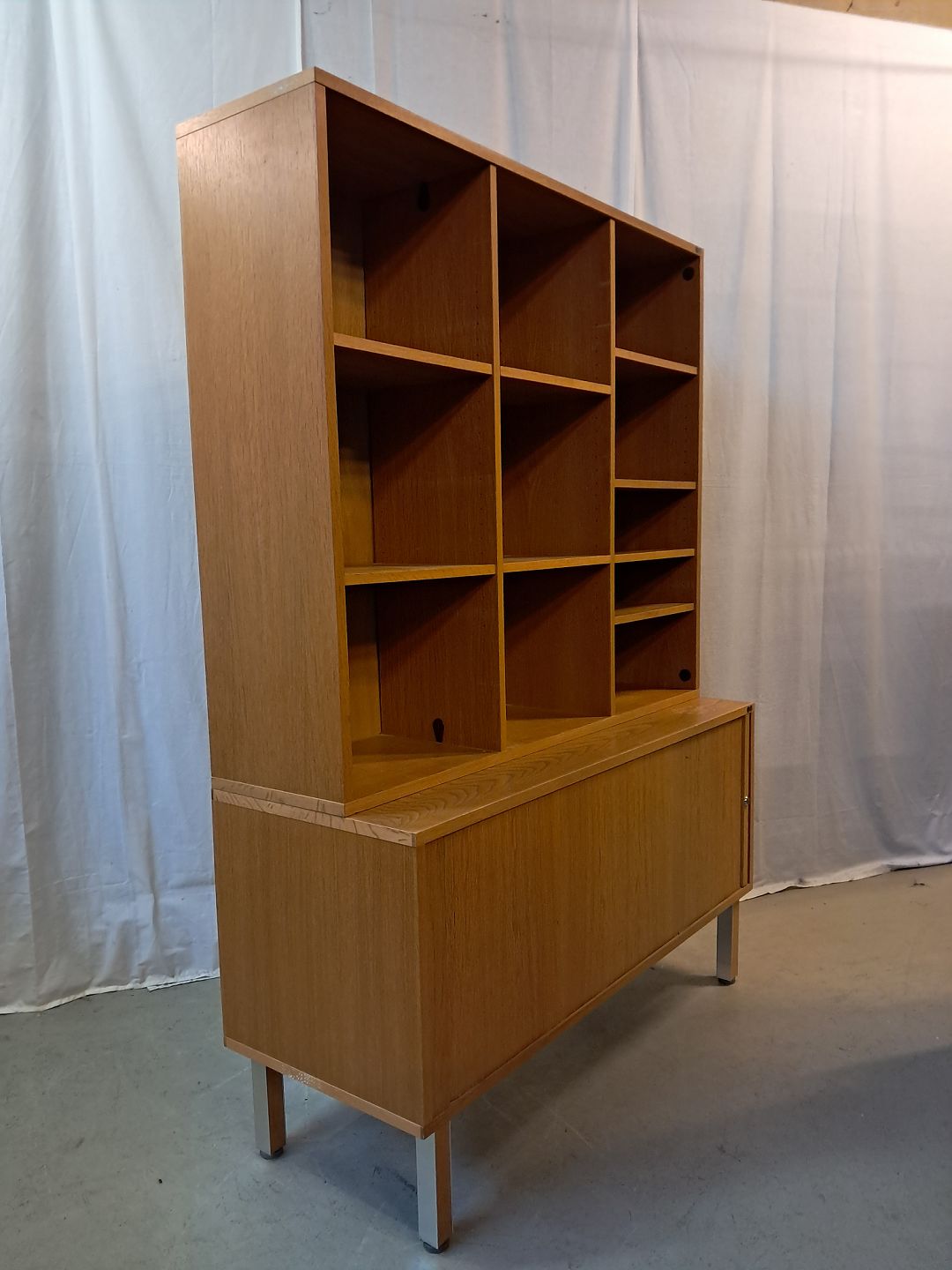 2 delt reolsektinon i fineret egetræ med jalousilåge, fra 1980erne.
