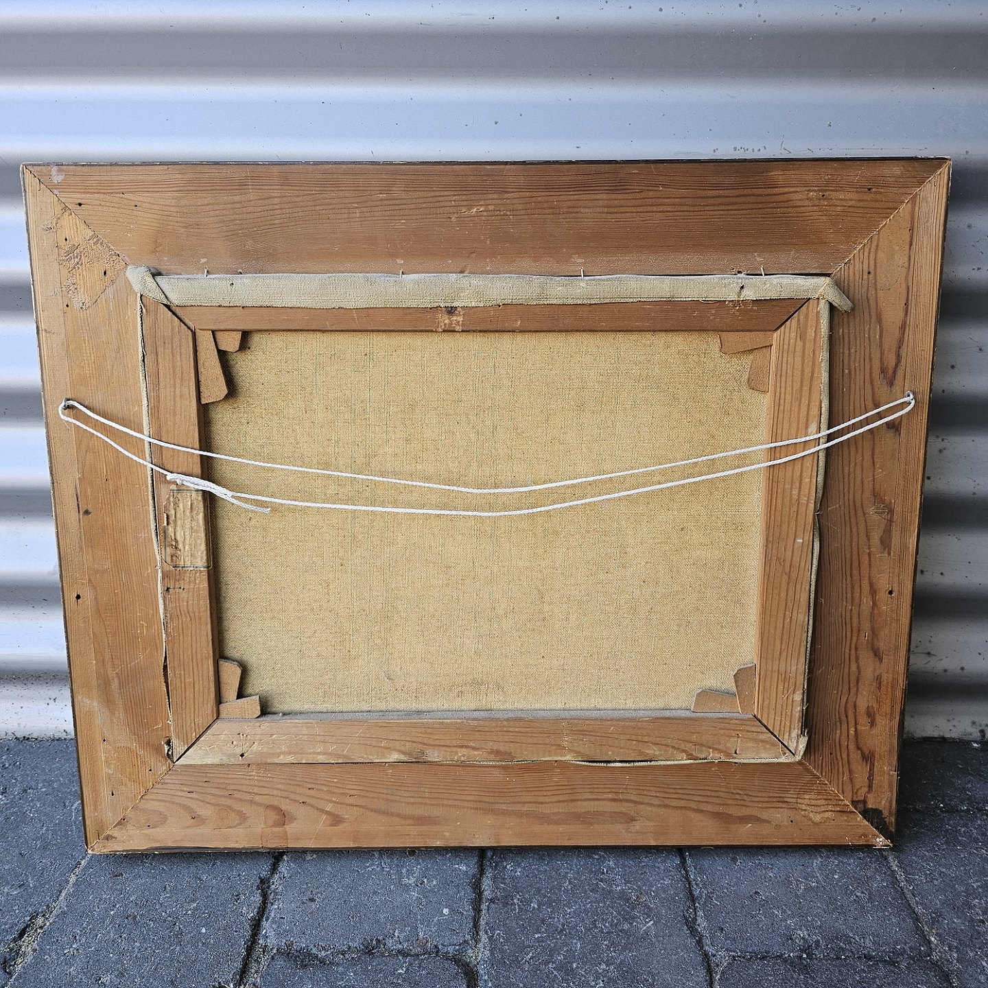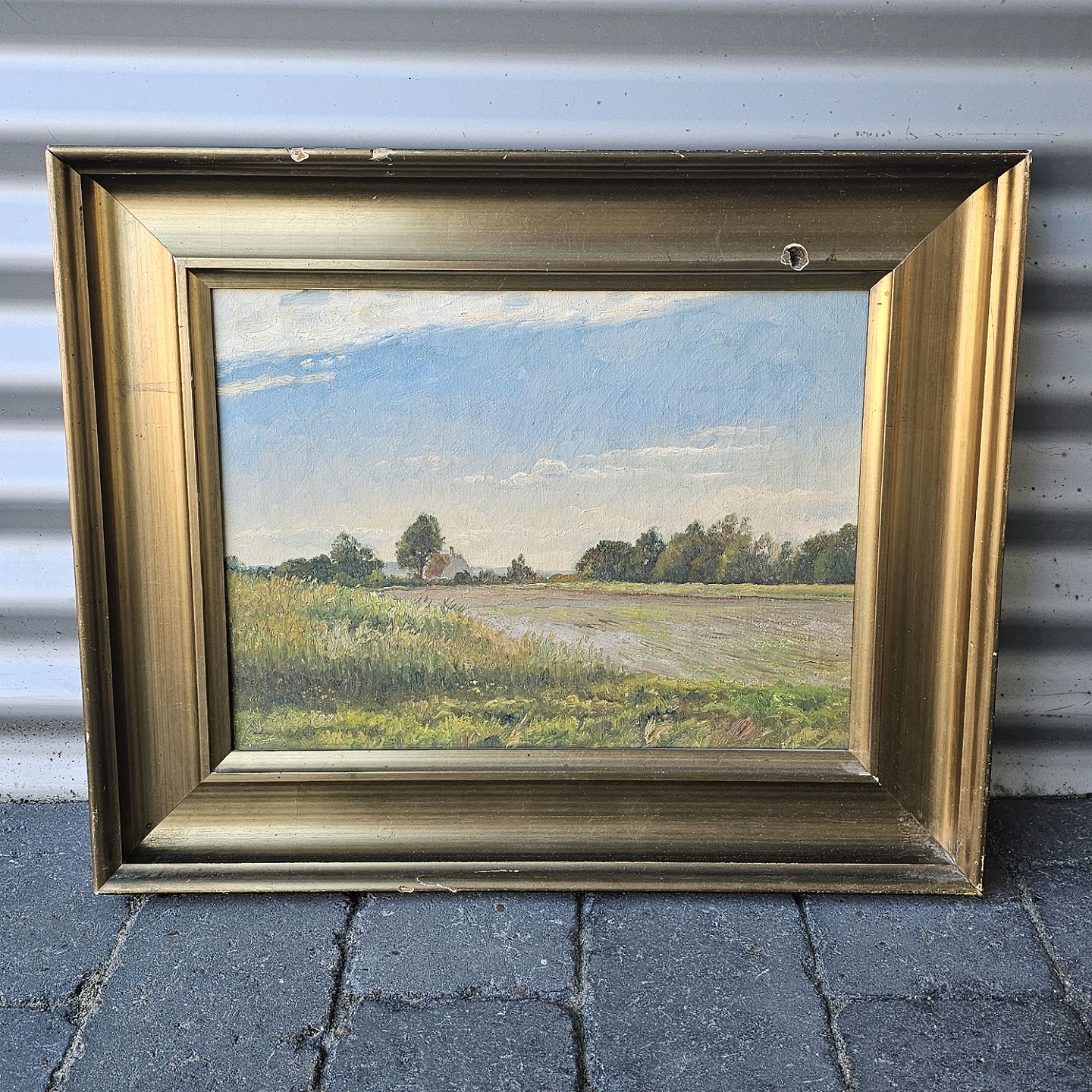 Oliemaleri på lærred monteret i bred træramme med landskabsmotiv