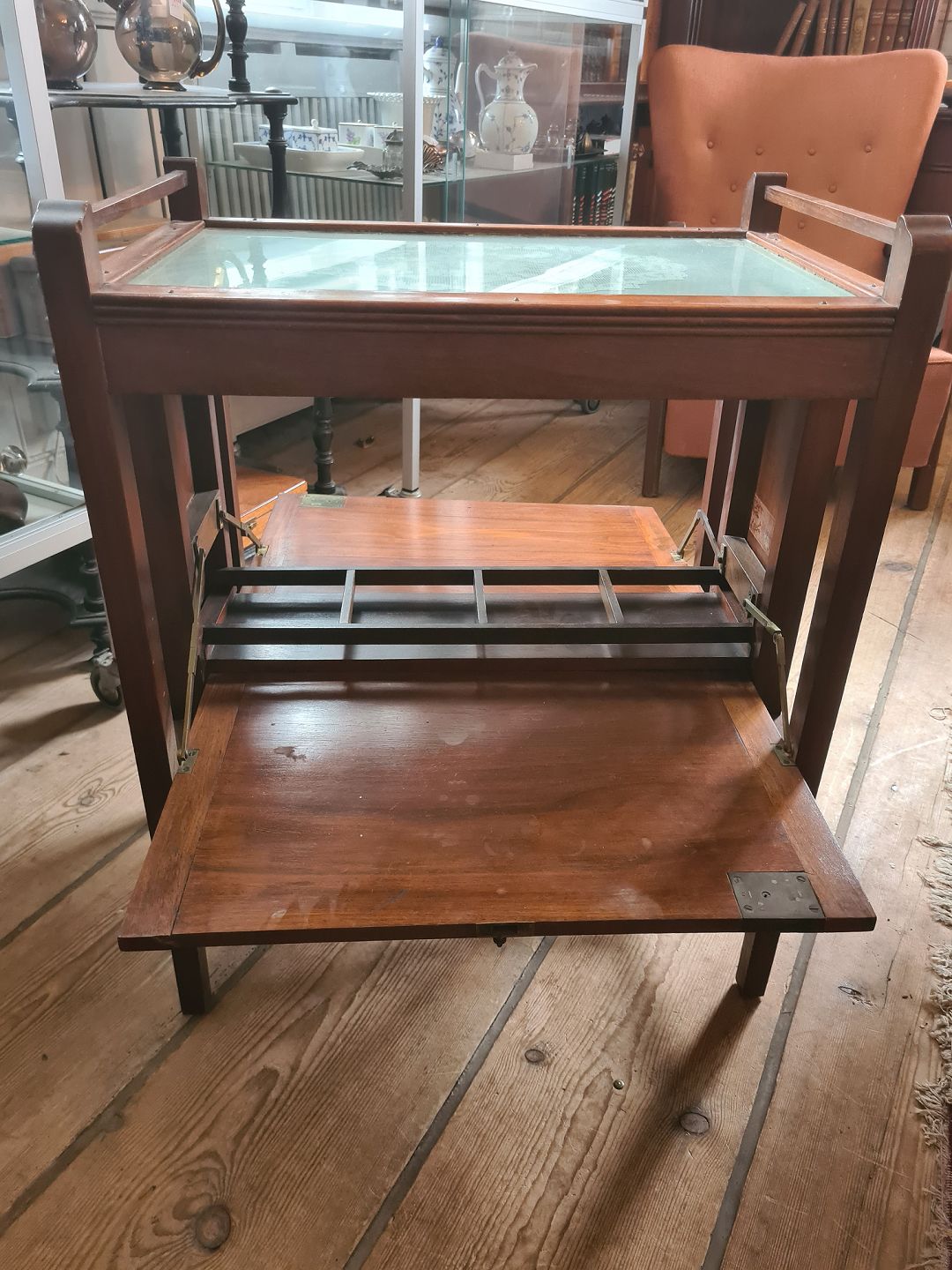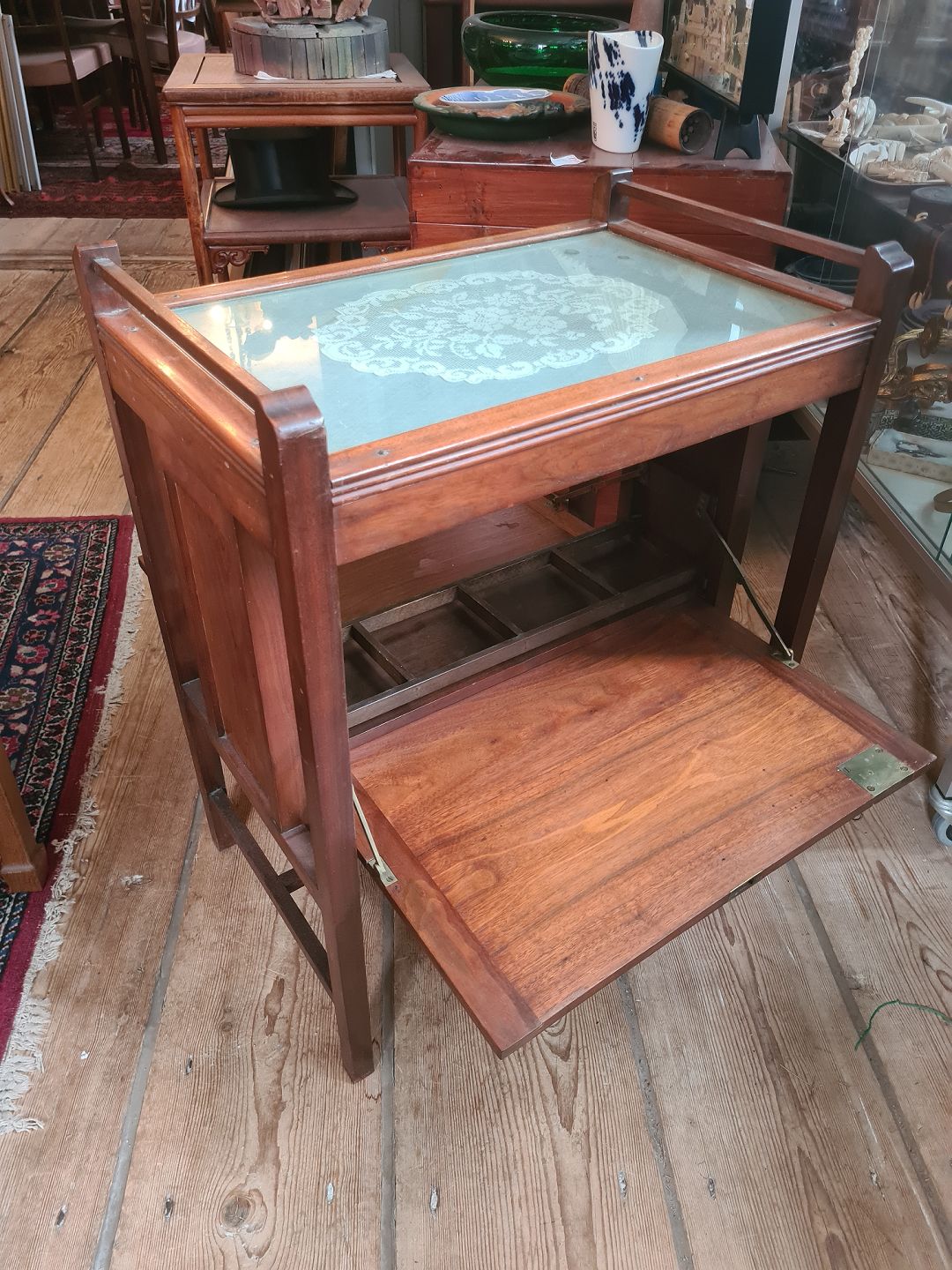 Lampebord fra 1930'erne i mahogni med glasplade og bar rum. Fremstår pænt velholdt og funktionsdygtigt, med kun en anelse brugsspor på broderiet under glaspladen.