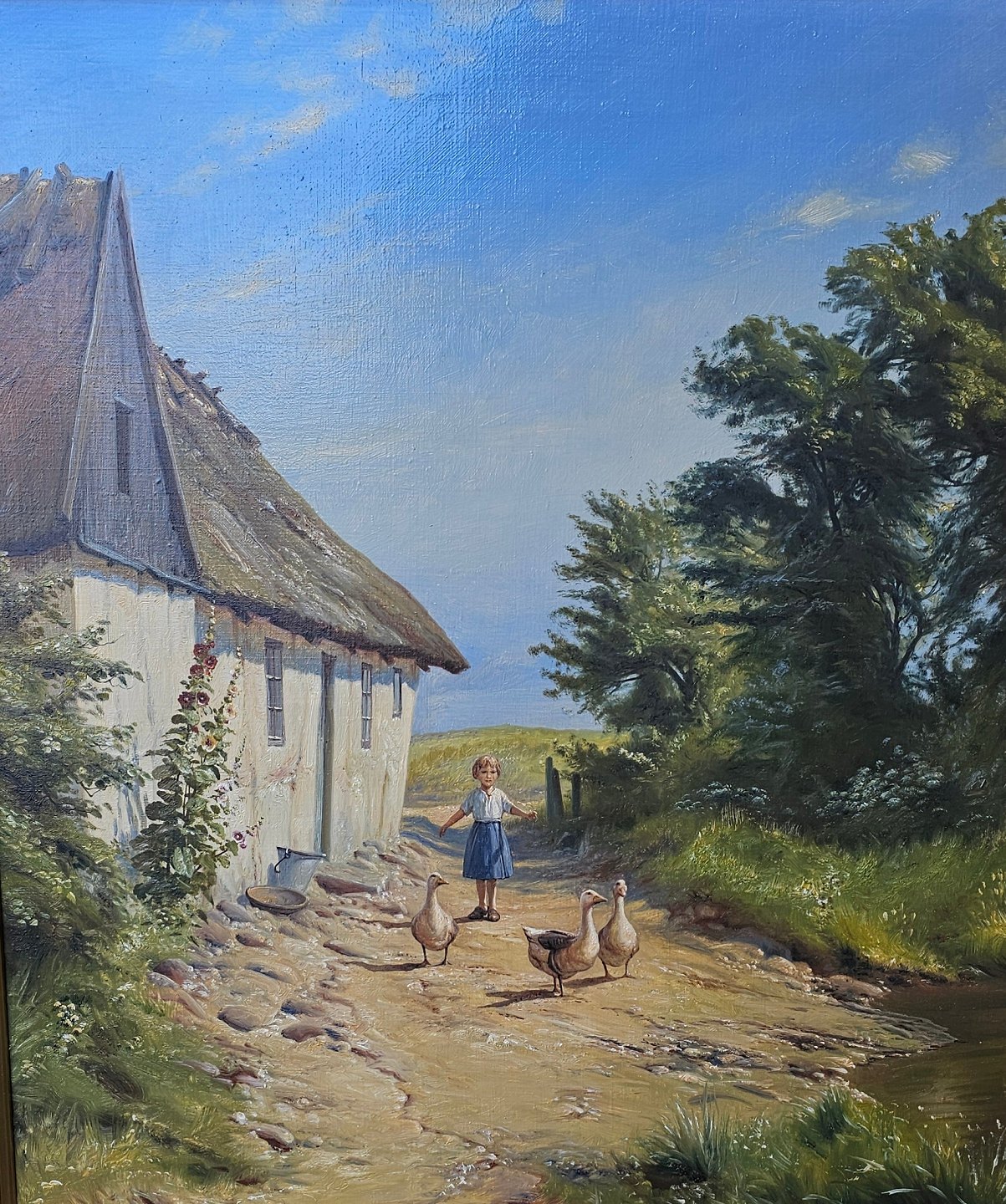 Oliemaleri på lærred i ornamenteret guldramme med motiv af en pige med gæs ved en gård