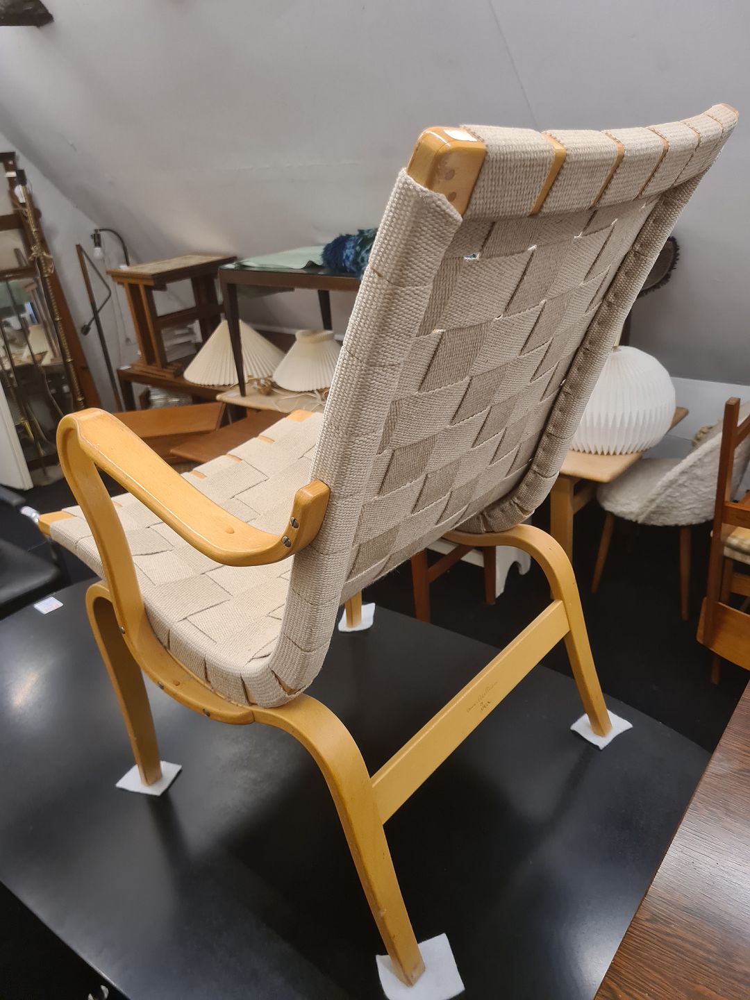 Evastol designet af Bruno Mathsson. Her en model fra 1994 i bøg og kanvasflet. Fremstår god og stabil med enkelte brugsspor på kanvas. (Billede)