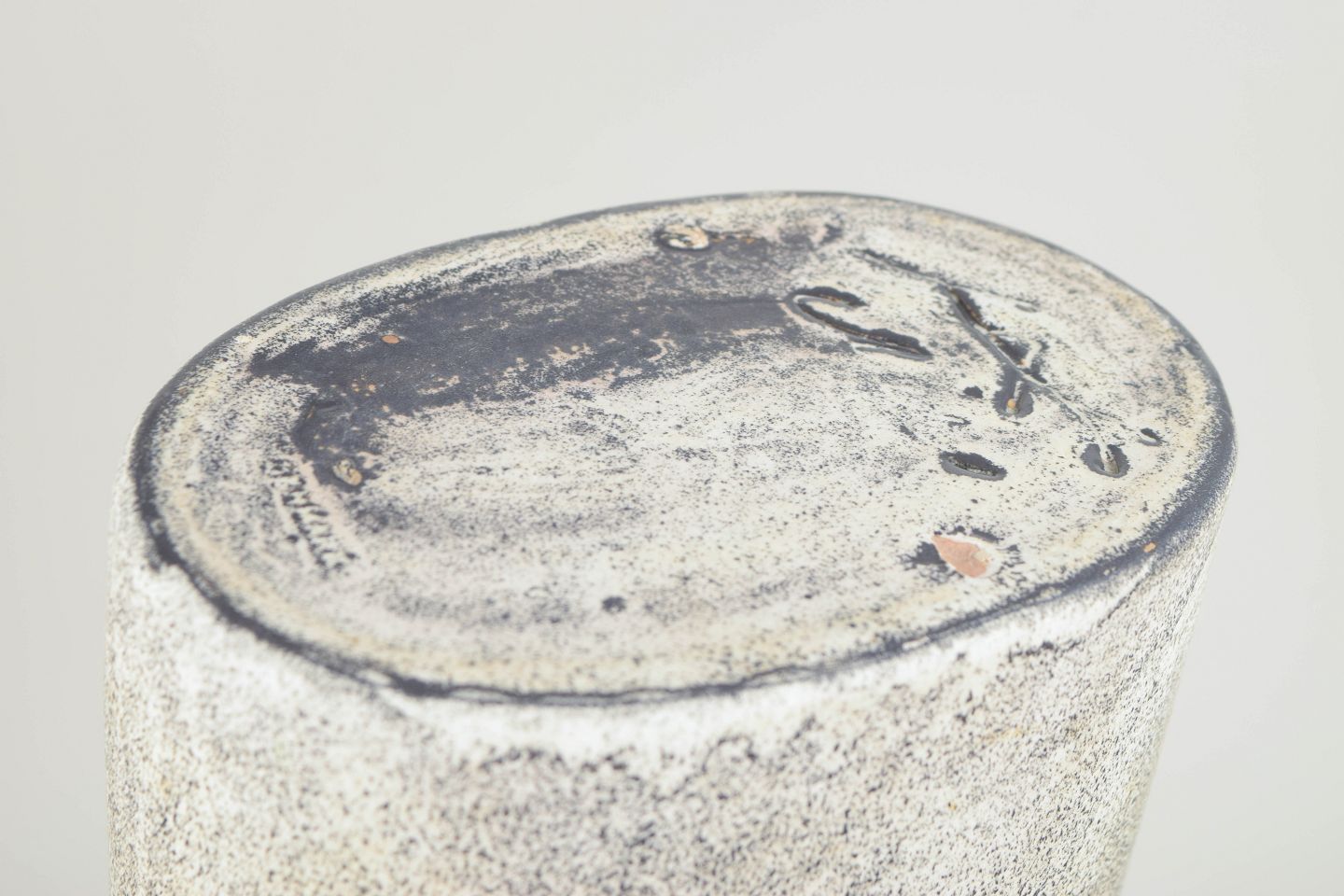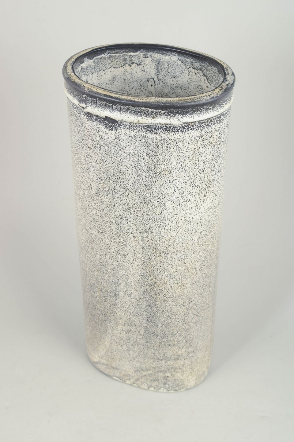 Stor vase i stentøj med cylindrisk form og karakteristisk dobbelt glasur i sorte og grå nuancer med levende, let krakeleret overflade. Et markant eksempel på Hammershøis monumentale formsprog og eksperimenterende glasurarbejde fra 1930’erne. Stemplet i bunden.